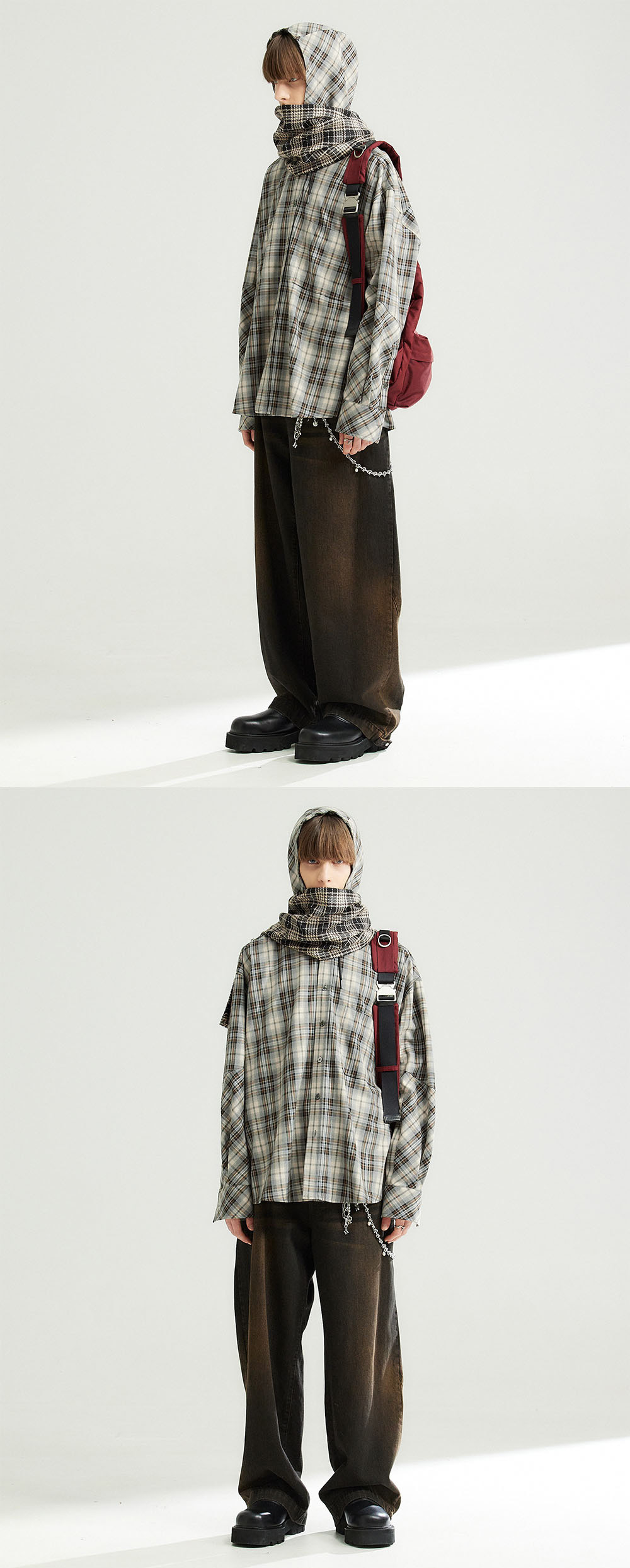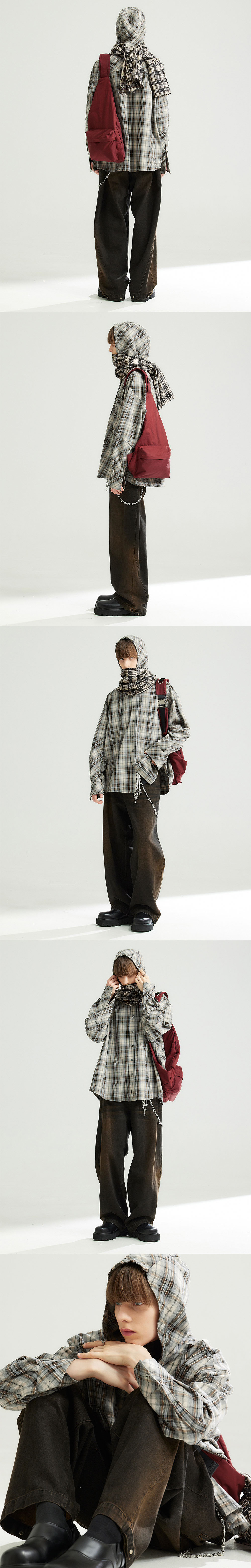 Haleine Back Side 2 Pleats Detail Check Hooded Shirts Grey