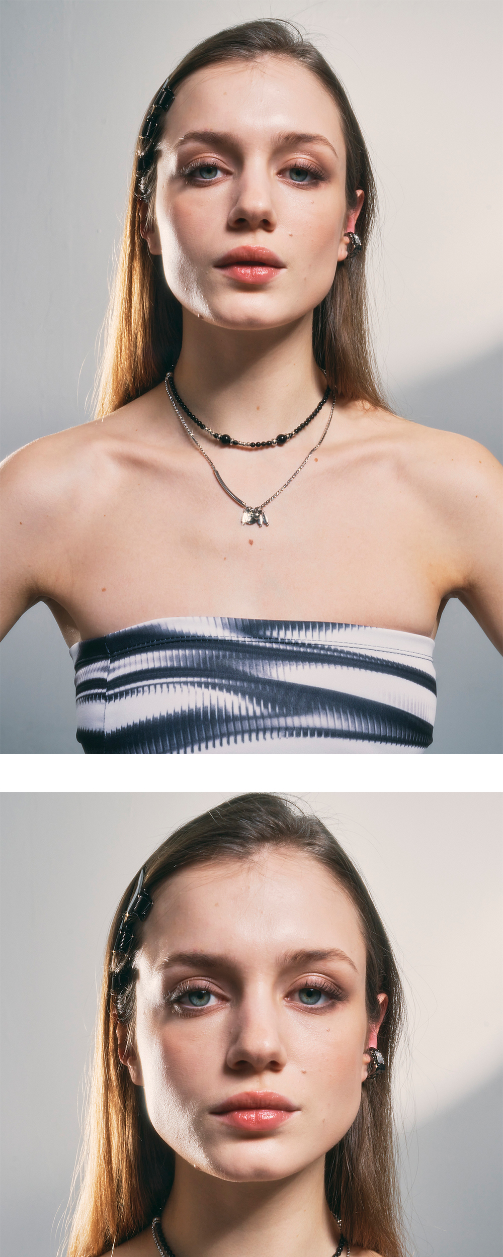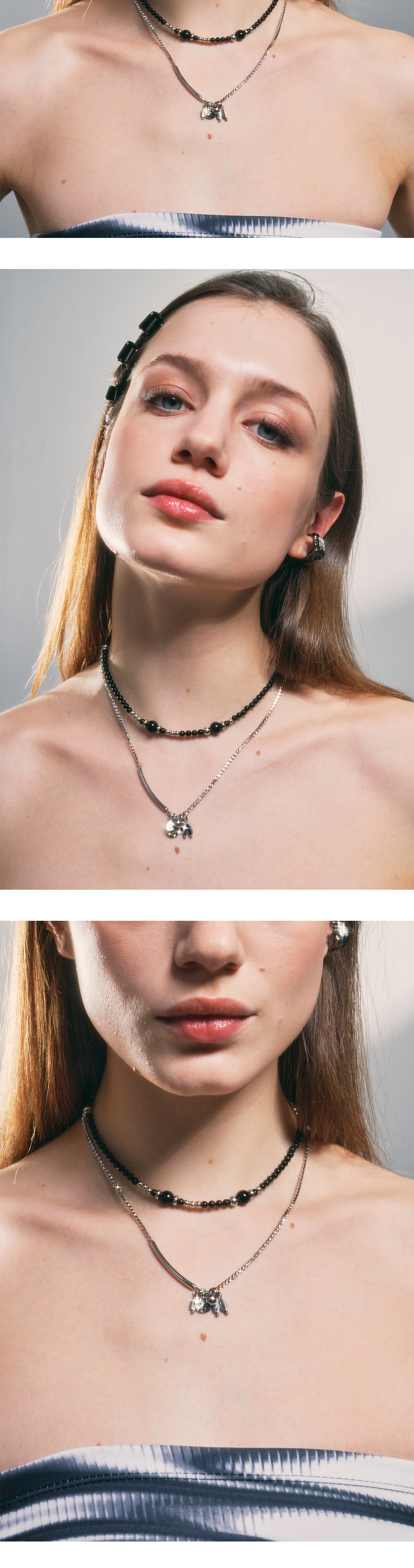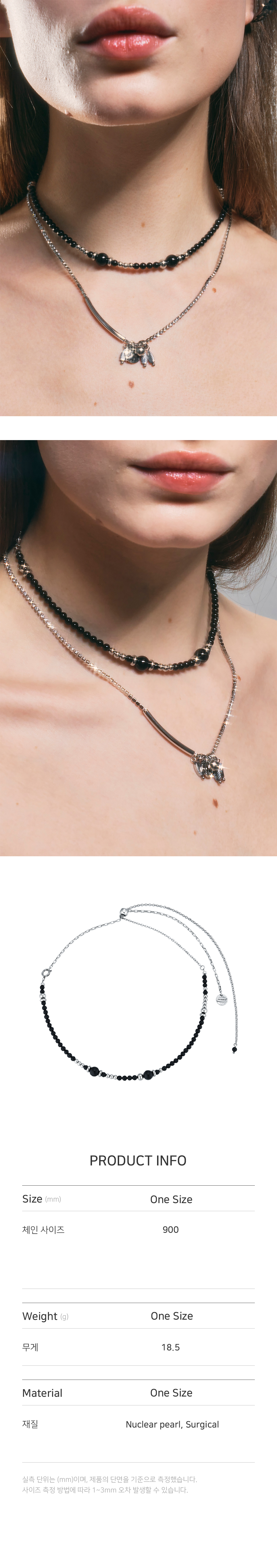 블랙 핵진주로 생산된 디자인으로 목 뒤쪽 볼 펜던트를 이용하여 사이즈를 자유롭게 조절하실 수 있는 디자인입니다. 초커 혹은 벨리체인 스타일링이 가능한 제품입니다.