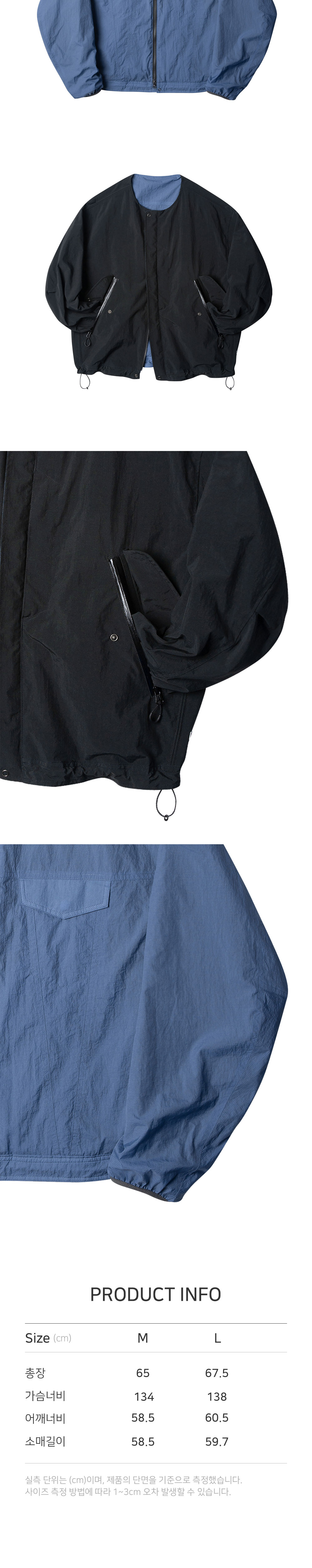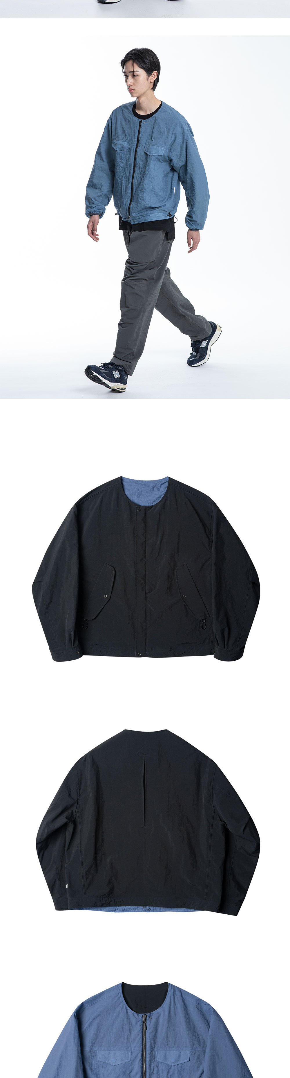 -USN 덱 재킷의 원형에서 상징적인 디테일을 재해석 -리버서블 타입으로 겉감은 단단한 터치의 나일론 소재, 안감은 경량 나일론소재로 상반되는 인상의 소재 구성 -컴팩트한 기장의 루즈 실루엣 -여유롭고 우아한 볼륨의 소매 설계 -시원한 인상의 칼라 리스 -가슴에 위치한 히든 지퍼 포켓과 허리 지퍼 포켓으로 구성 -어깨, 사이드 패널의 절개 부위에 파이핑 코드를 넣어 입체적으로 제작 -소매 커프스 사이즈 조절 가능한 어저스터 -밑단 사이즈 조절이 가능한 스트링 어저스터 -앞 여밈 2-way 리버서블 지퍼