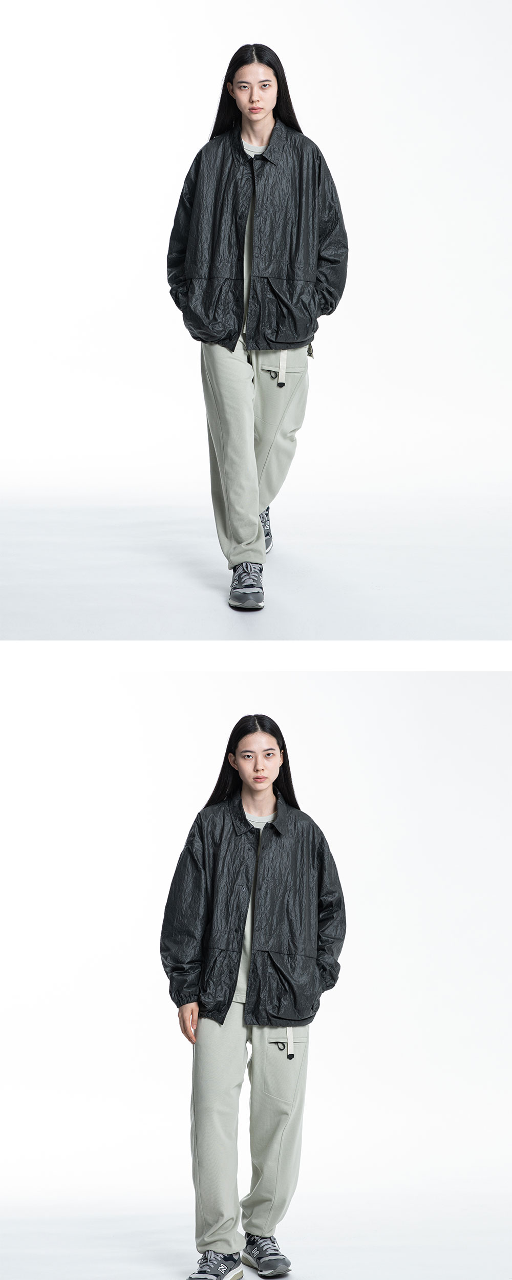 -코치 재킷 타입의 심플하며 스포티한 요소를 더한 디자인 -루즈 실루엣 -돌먼 슬리브 설계로 여유로우며 편안한 착용감 -컨버터블 칼라로 단추를 여미거나 풀어서 연출 -사이드 포켓과 입체 카고 포켓으로 여유로운 수납 공간 제공 -소매 밴드 타입 -나일론 소재를 시레(Cire) 가공하여 표면의 자연스러운 광택과 주름 가공으로 불규칙한 구김의 텍스쳐