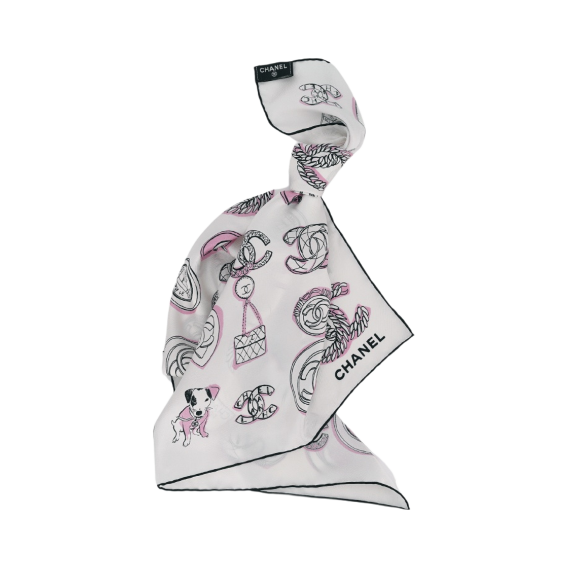 (W) Chanel Square Scarf Silk Twill & White Pink Black