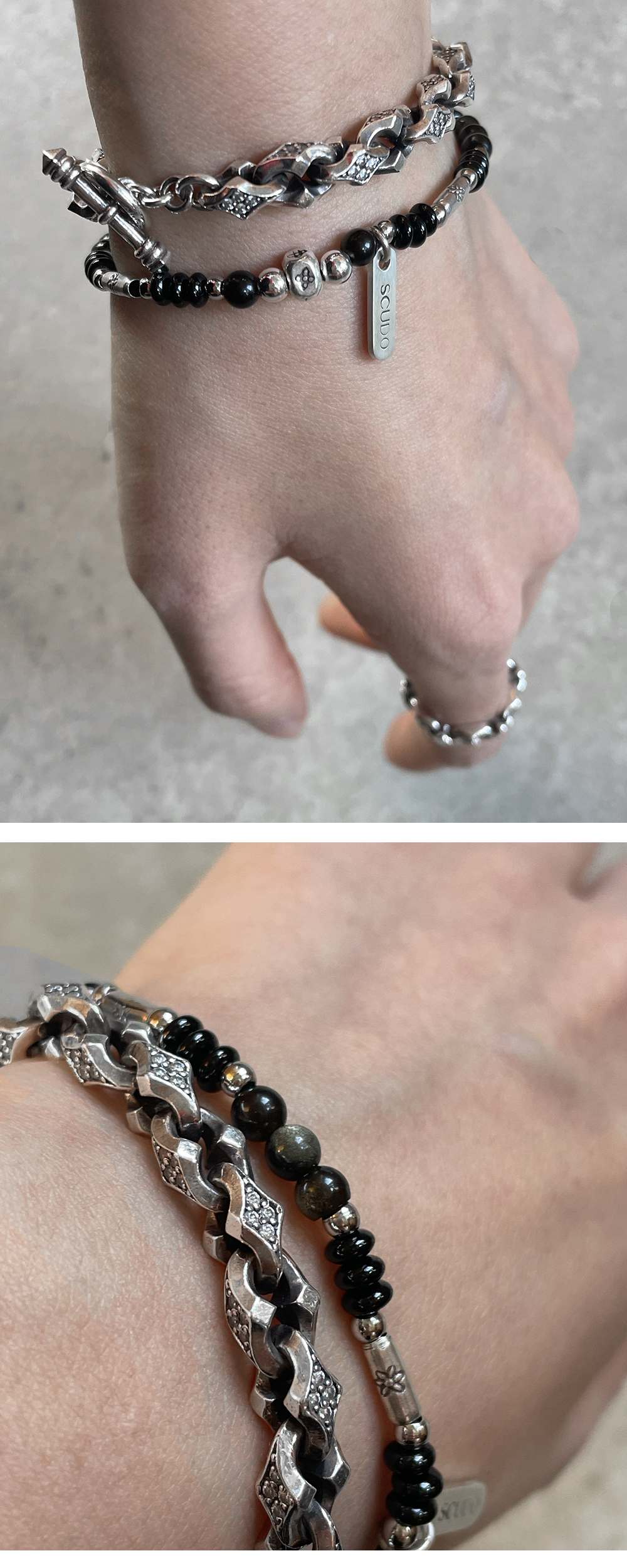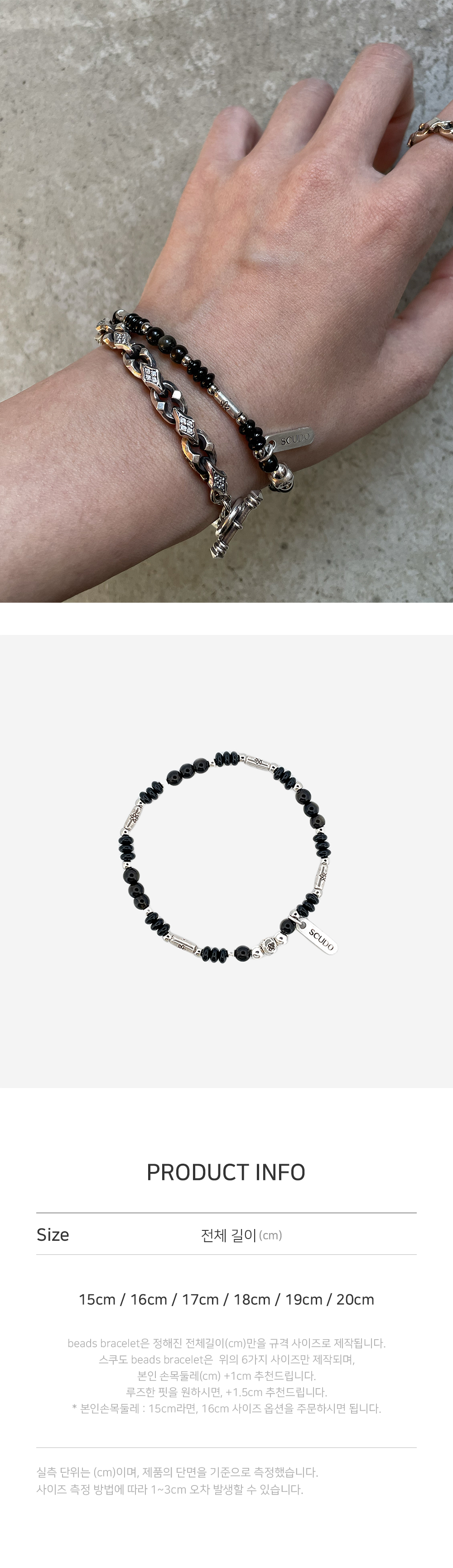 [beads line] 스쿠도 네임텍과 다양한 무늬의 핸드메이드 카렌실버로 이루어진 비즈 브레슬릿 옵시디언 과 오닉스 원석 비즈 믹스로 디자인된 브레슬릿 *고산족 카렌실버는 수공예 핸드메이드 실버이기때문에, 같은 디자인이여도 모두 조금씩 다르며, 입고되는 디테일이 동일 할 수 없습니다. 그렇기 때문에, 비슷한 크기의 다른 디테일의 카렌실버 참으로 랜덤 되어 제작될 수 있습니다. *비즈 브레슬릿 특성상 A/S가 불가능 합니다. 스쿠도의 beads bracelet은 맞춤 handcraft 주얼리로, 3일 제작기간이 소요됩니다. (주말 / 공휴일 제외) 추가 제품 상담이 필요하시면, 문의 부탁드립니다.
