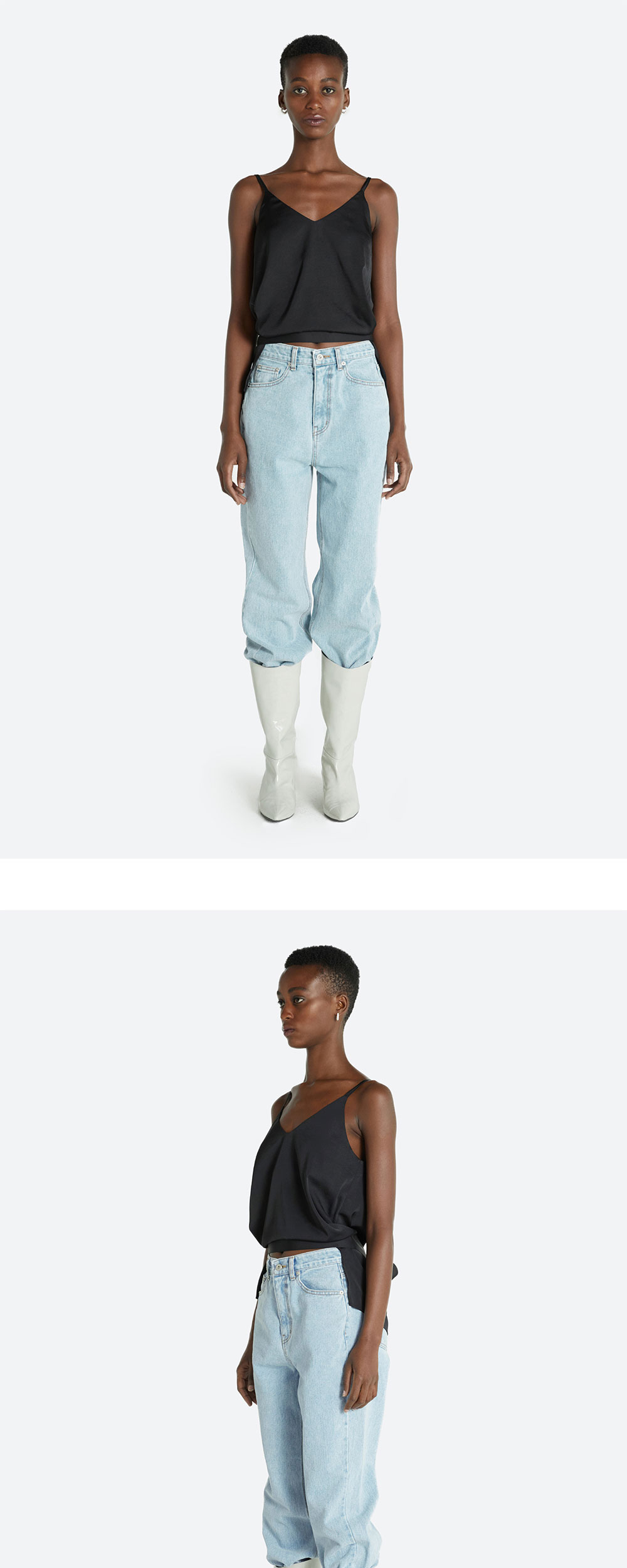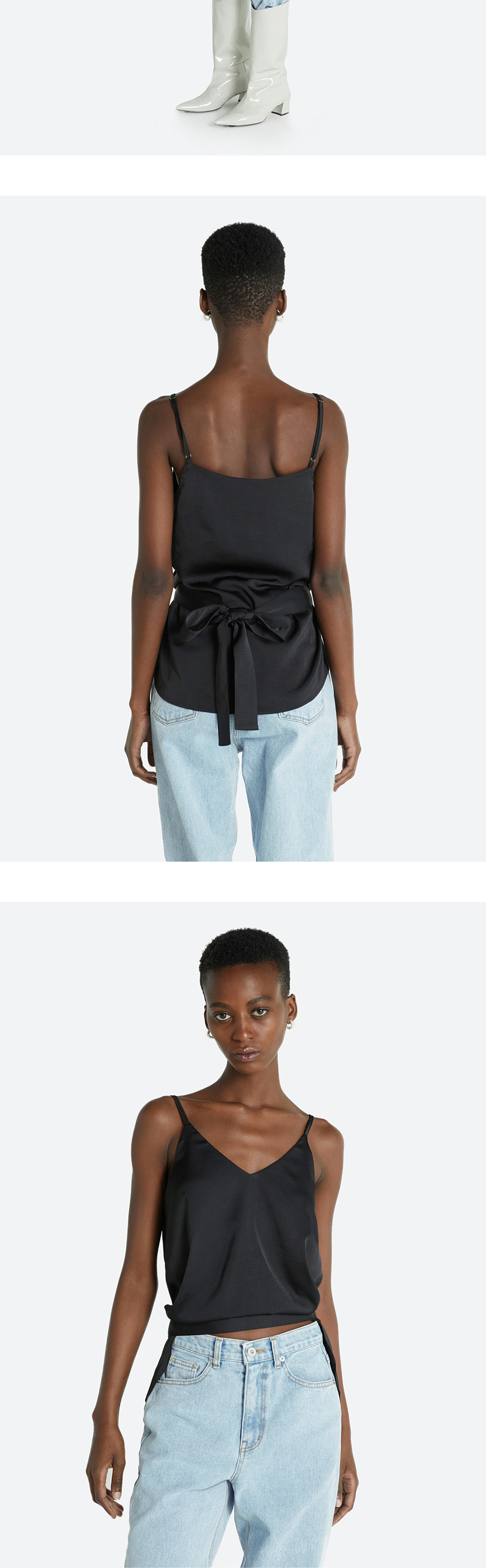 브이 네크 라인과 백 리본 포인트가 돋보이는 블라우스 탑입니다. 스판이 함유된 소재와 실키한 반광 재질로 고급스러운 무드를 연출합니다. HAVELESS FRONT POINT TROUSERS 팬츠와 셋업 매치 가능합니다.