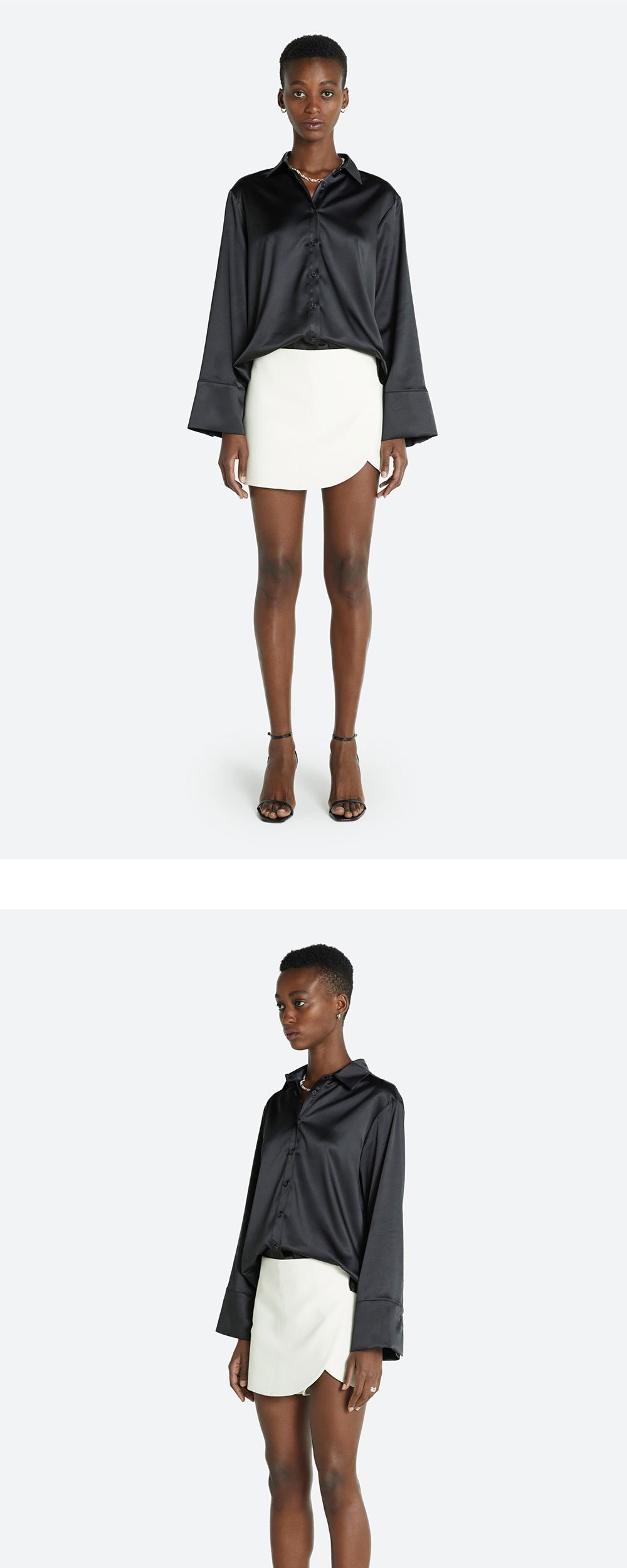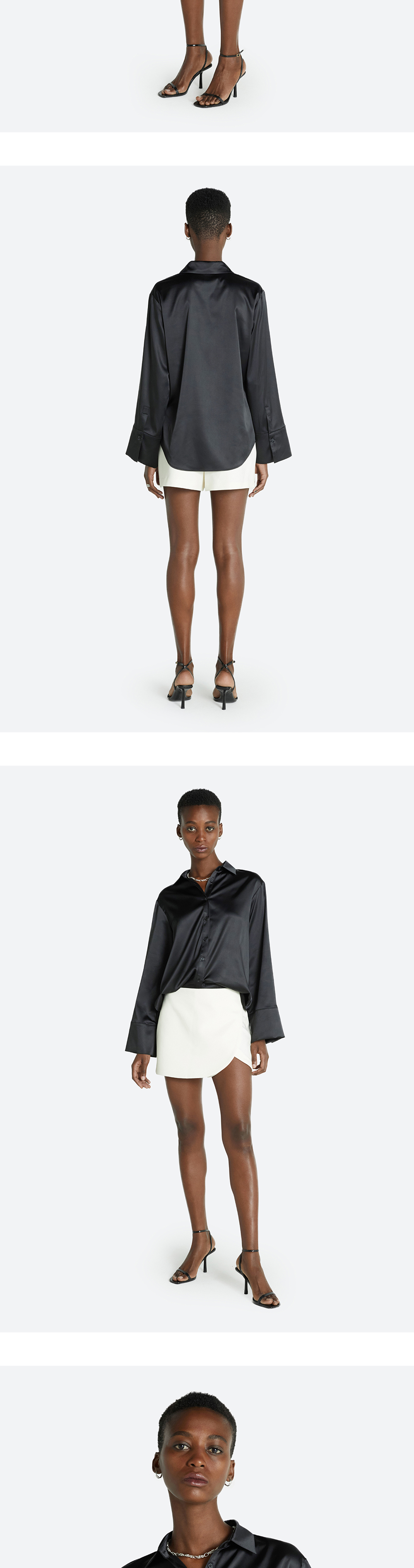 와이드한 소매 커프와 실키한 광이 돋보이는 셔츠입니다. 스판성이 함유되어 활동성이 우수하고 페미닌한 무드의 클래식한 탑입니다.