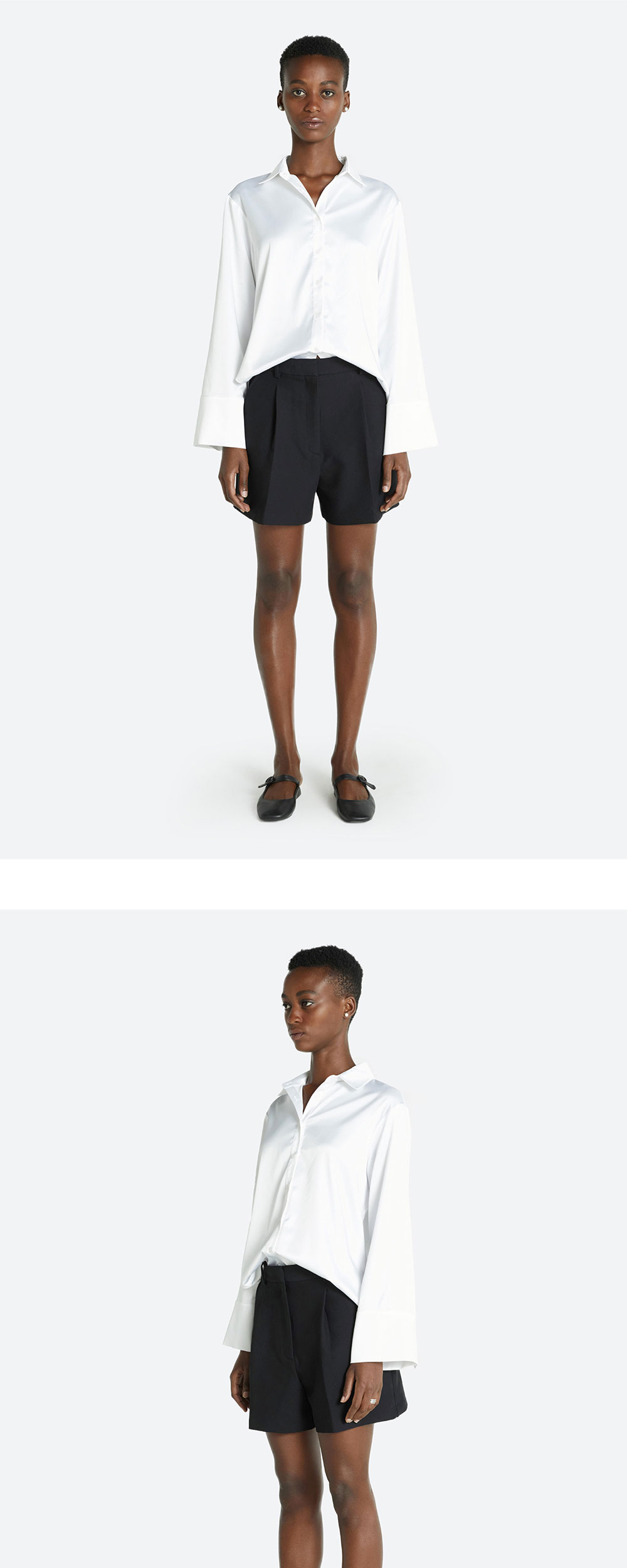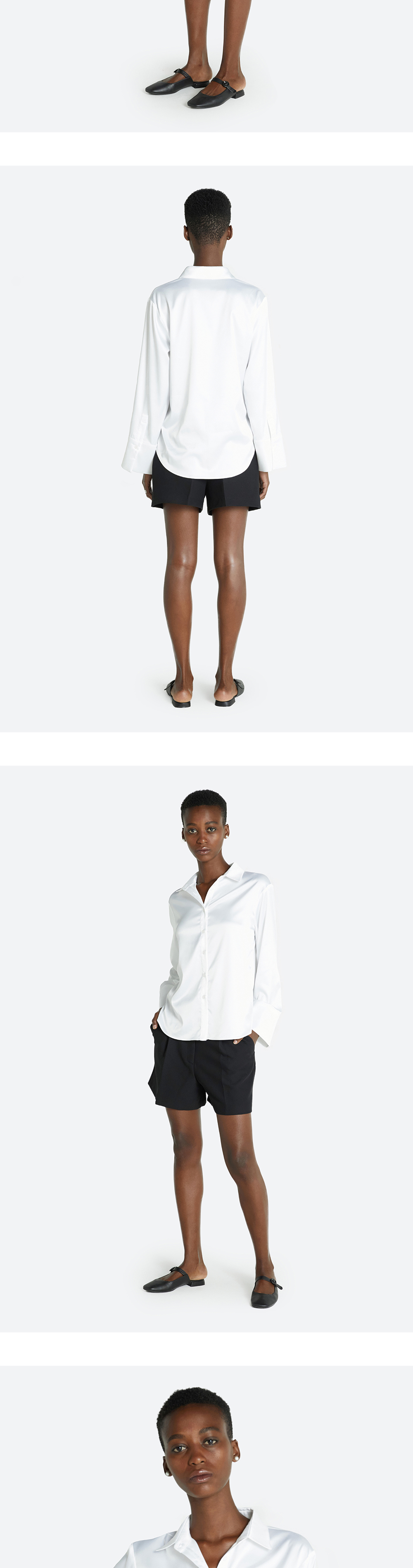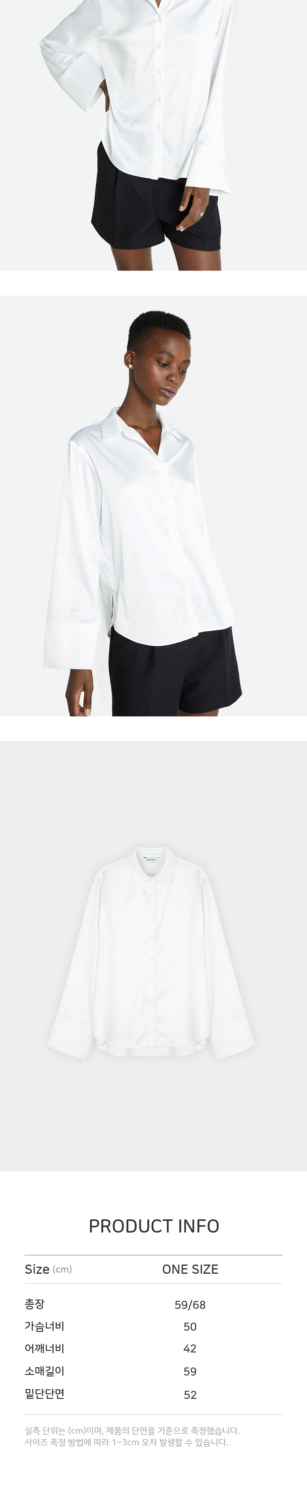 와이드한 소매 커프와 실키한 광이 돋보이는 셔츠입니다. 스판성이 함유되어 활동성이 우수하고 페미닌한 무드의 클래식한 탑입니다.