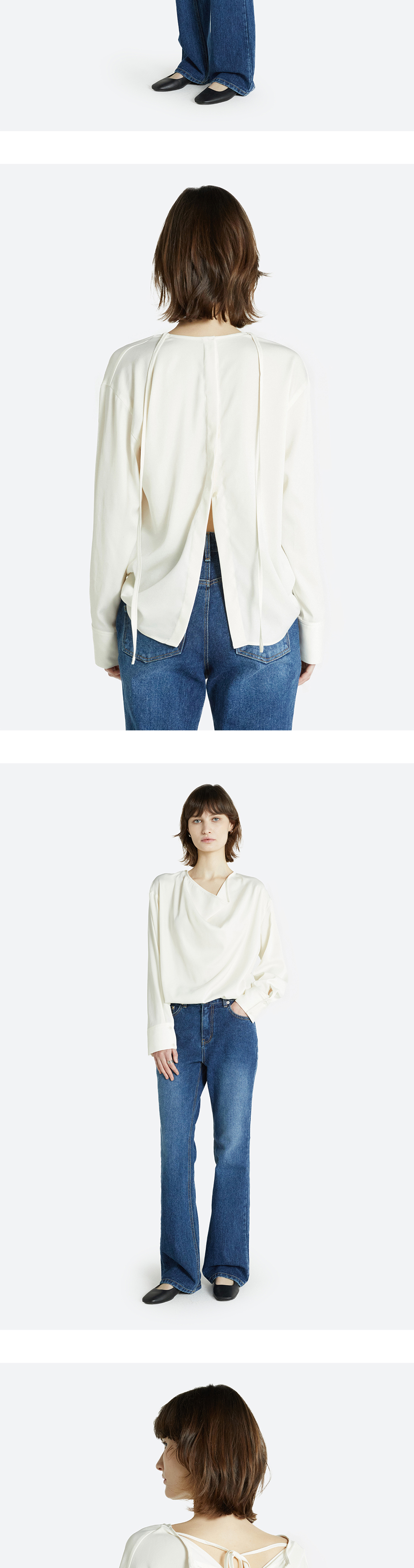 드레이프 네크 라인과 백 포인트가 돋보이는 블라우스 탑입니다. 실키한 반광 소재로 제작되었으며 백 사이드의 단추와 스트링 끈으로 여밈과 오픈 백이 가능한 2-WAY 디자인입니다.