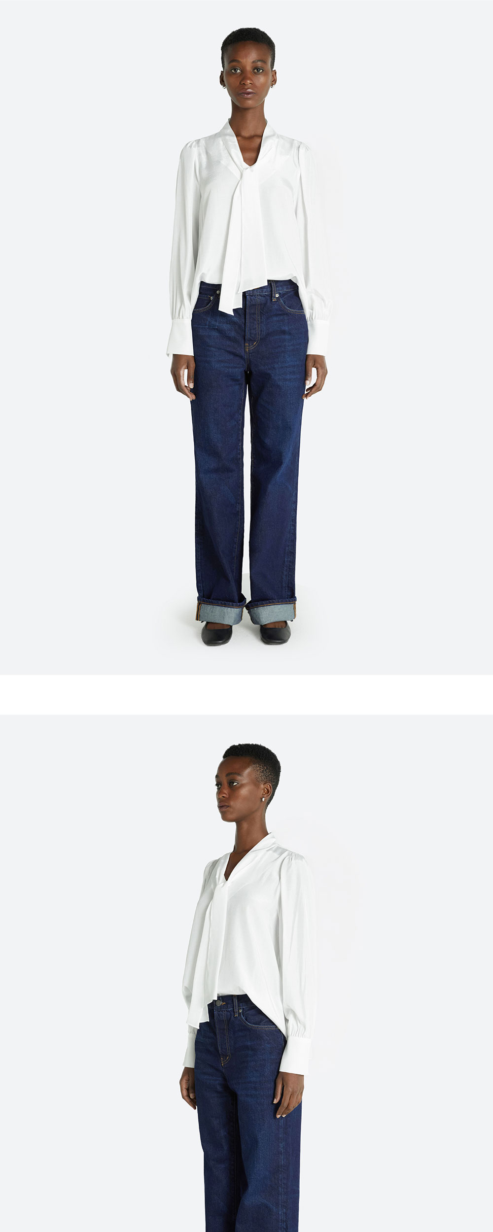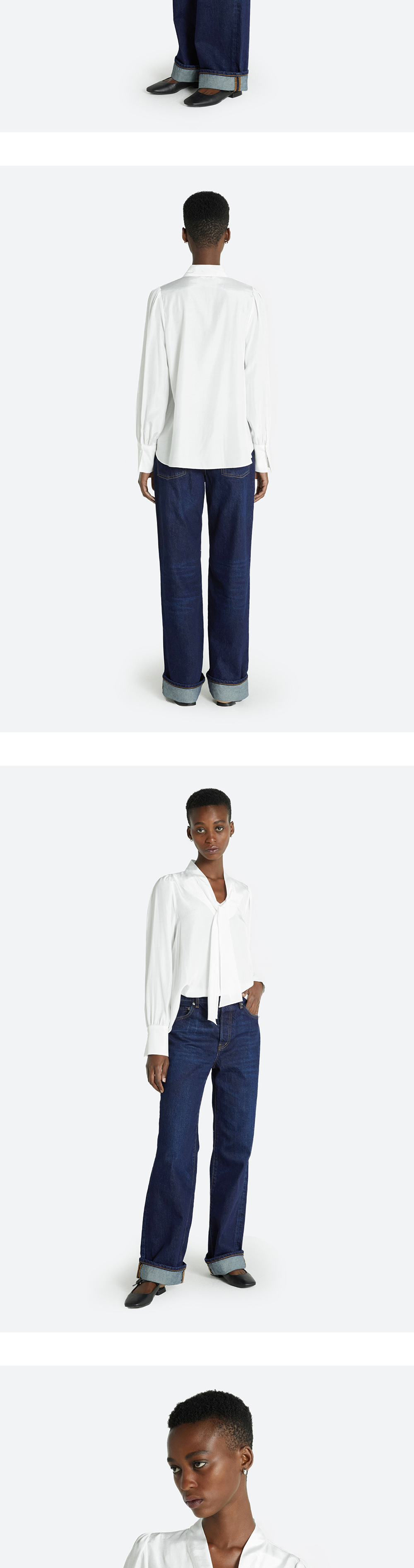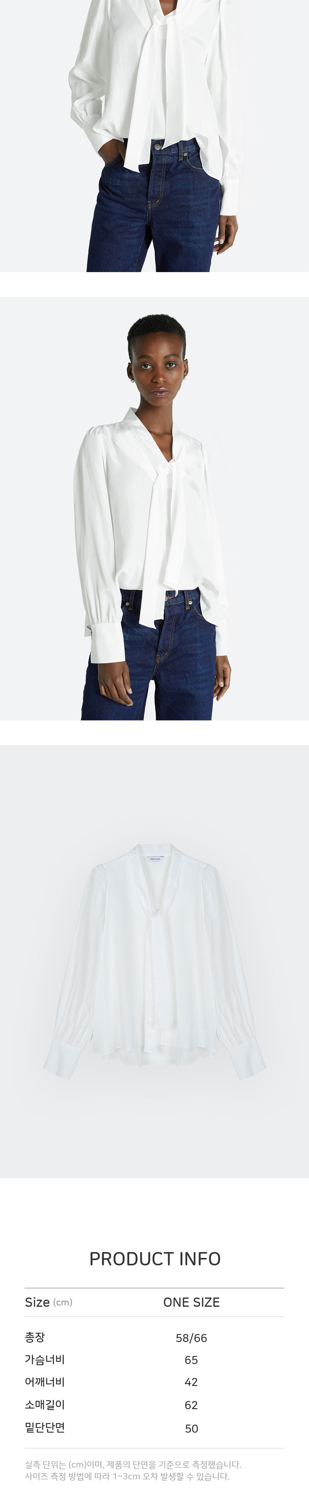 풀 오버 소매와 전면의 타이 디테일이 돋보이는 블라우스 탑입니다. 반광의 쉬어한 소재와 볼륨감으로 페미닌하고 고급스러운 무드를 연출합니다.