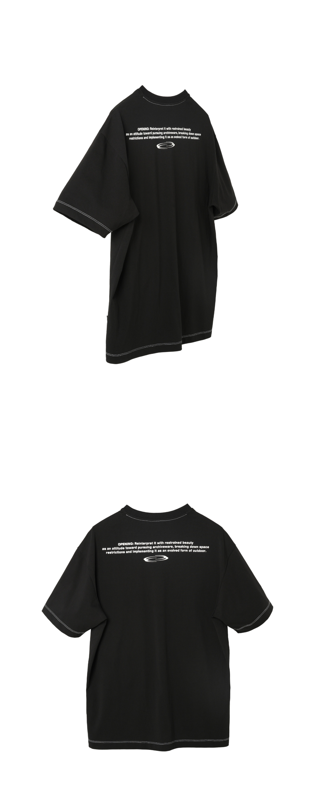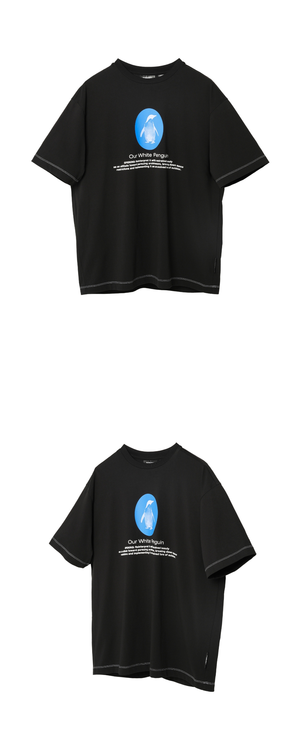 착용 시 어깨선이 자연스럽게 내려간 여유로운 세미 오버핏 실루엣의, 브랜드 시그니처 화이트 펭귄 그래픽과 스티치 컬러 포인트가 특징인 숏 슬리브 티셔츠입니다.