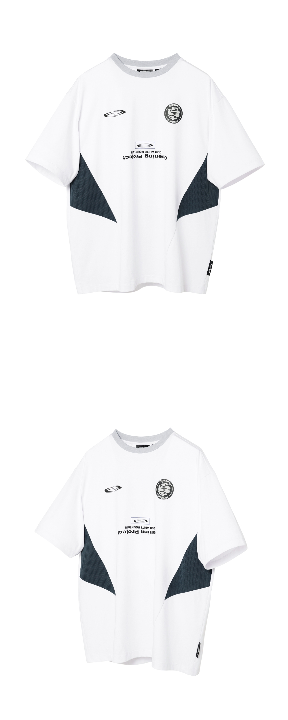 [배송 일정 안내] 해당 상품 1,3 사이즈는 5월 29일 출고 예정입니다. 2사이즈는 주문 후 다음 영업일 즉시 출고 가능합니다. 구매 이용시 참고 바랍니다. [상품 설명] 착용 시 어깨선이 자연스럽게 내려간 여유로운 세미 오버핏 실루엣의, 축구 유니폼 배치의 오프닝프로젝트 로고 그래픽이 특징인 숏슬리브 티셔츠입니다.