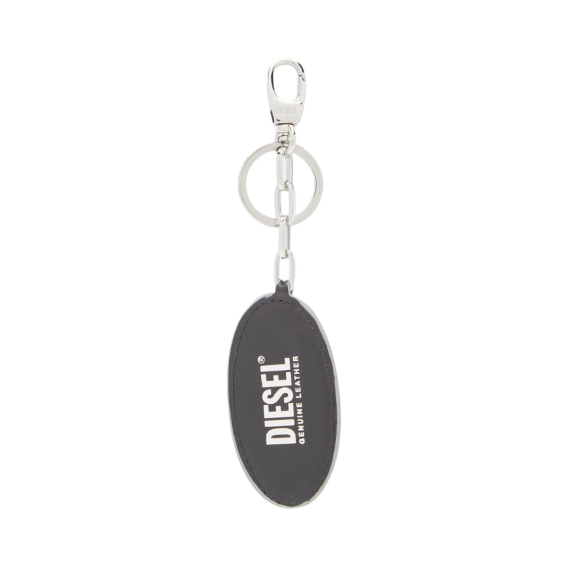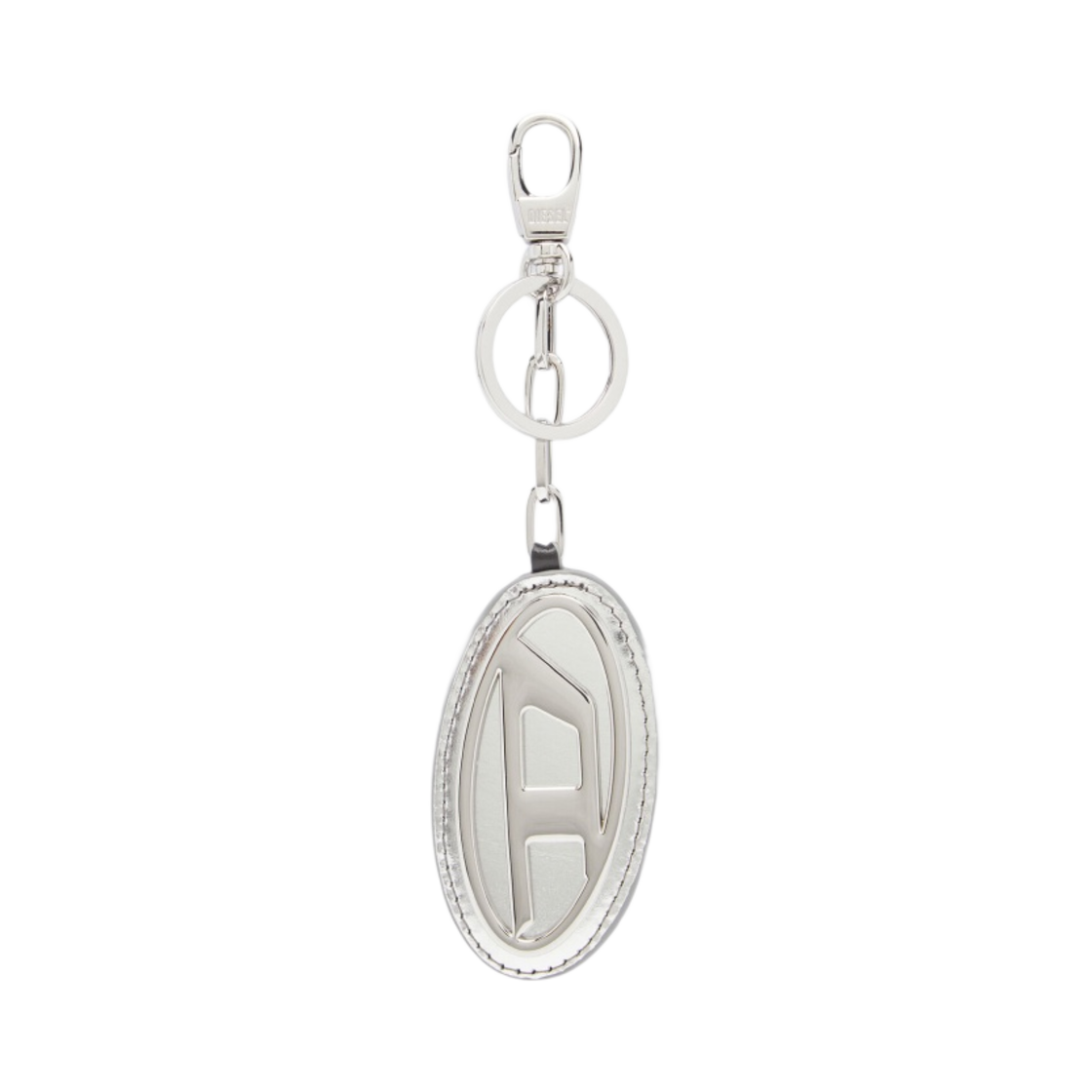 Diesel Holy D Mirror Leather Logo Plaque Keyring Silver