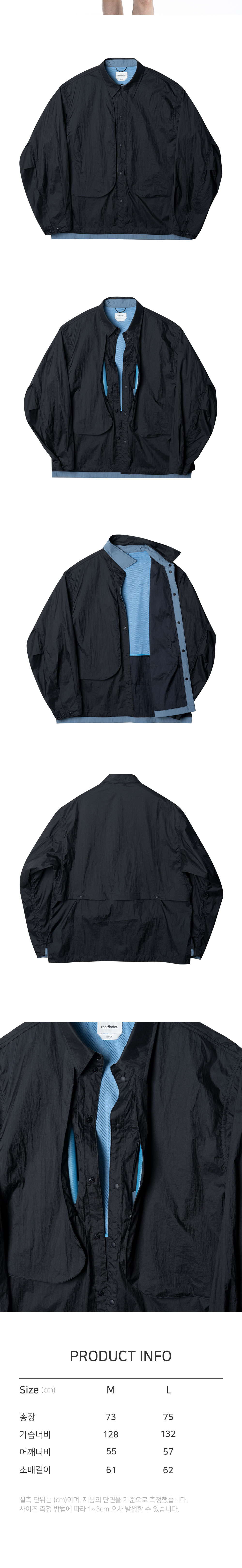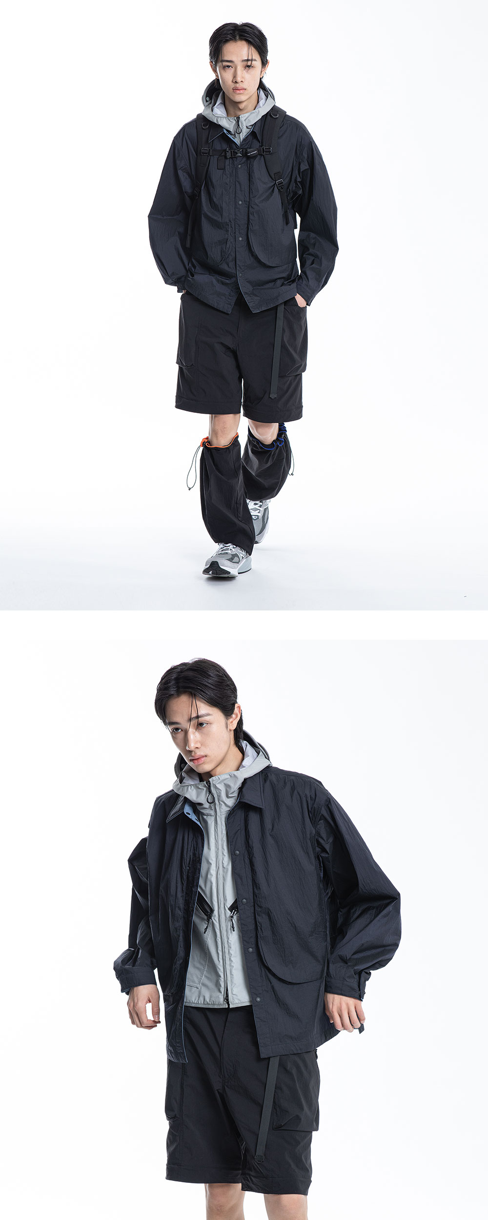 -피싱 셔츠의 요소를 재해석한 셔츠형 재킷 -캐쥬얼한 표정의 밴드 칼라 -입체적으로 설계된 게임 포켓과 여름철 습기 배출을 위한 벤틸레이션 디테일 -손을 넣는 활동을 고려한 트임 디테일과 앞 길이를 짧게 재단하여 경쾌한 움직임 연출 -컴팩트한 기장의 루즈 실루엣 -트라이앵글 슬리브 설계로 편안한 활동성과 소매 2턱 디테일로 우아한 볼륨감 연출 -경량 나일론 소재로 바스락 거리는 텍스쳐와 가벼운 착용감을 위한 홀겹 제작 -자주 닿는 부위는 배색하여 견고함을 더하고 스포티한 무드 연출