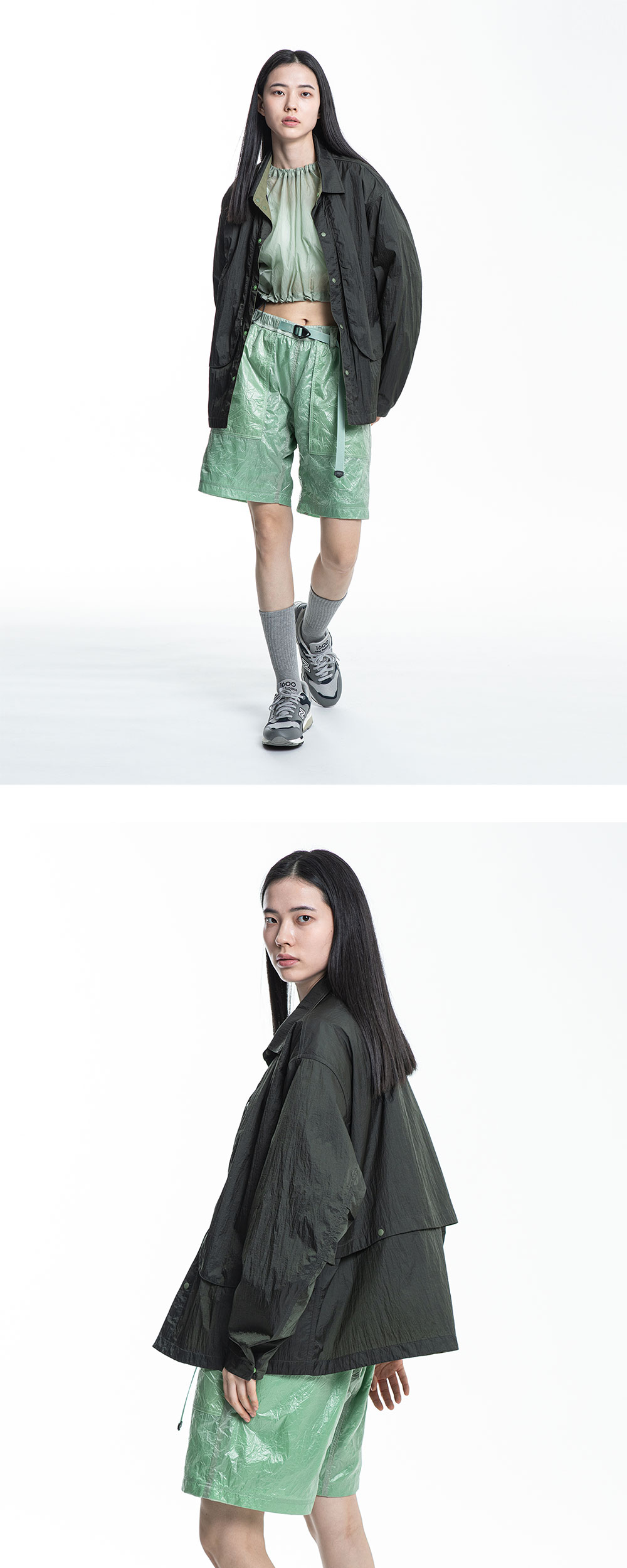 -피싱 셔츠의 요소를 재해석한 셔츠형 재킷 -캐쥬얼한 표정의 밴드 칼라 -입체적으로 설계된 게임 포켓과 여름철 습기 배출을 위한 벤틸레이션 디테일 -손을 넣는 활동을 고려한 트임 디테일과 앞 길이를 짧게 재단하여 경쾌한 움직임 연출 -컴팩트한 기장의 루즈 실루엣 -트라이앵글 슬리브 설계로 편안한 활동성과 소매 2턱 디테일로 우아한 볼륨감 연출 -경량 나일론 소재로 바스락 거리는 텍스쳐와 가벼운 착용감을 위한 홀겹 제작 -자주 닿는 부위는 배색하여 견고함을 더하고 스포티한 무드 연출