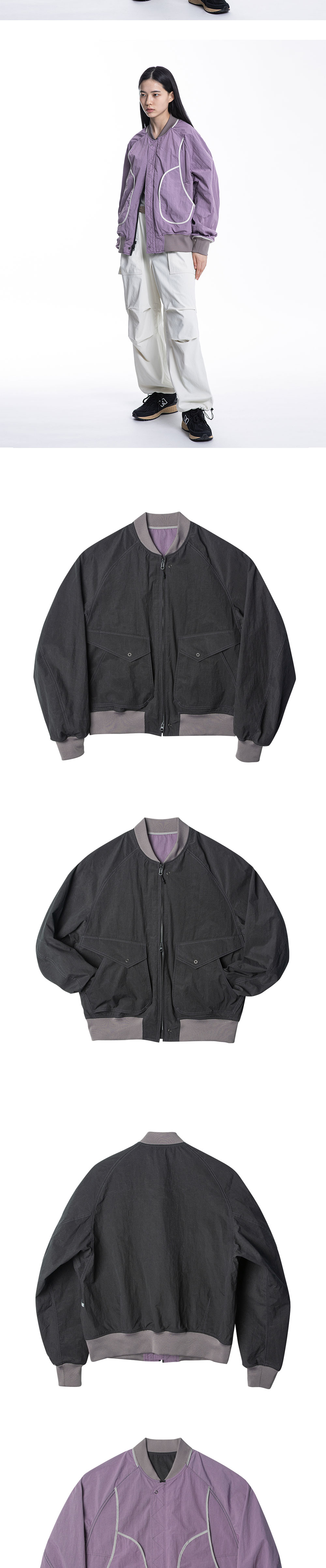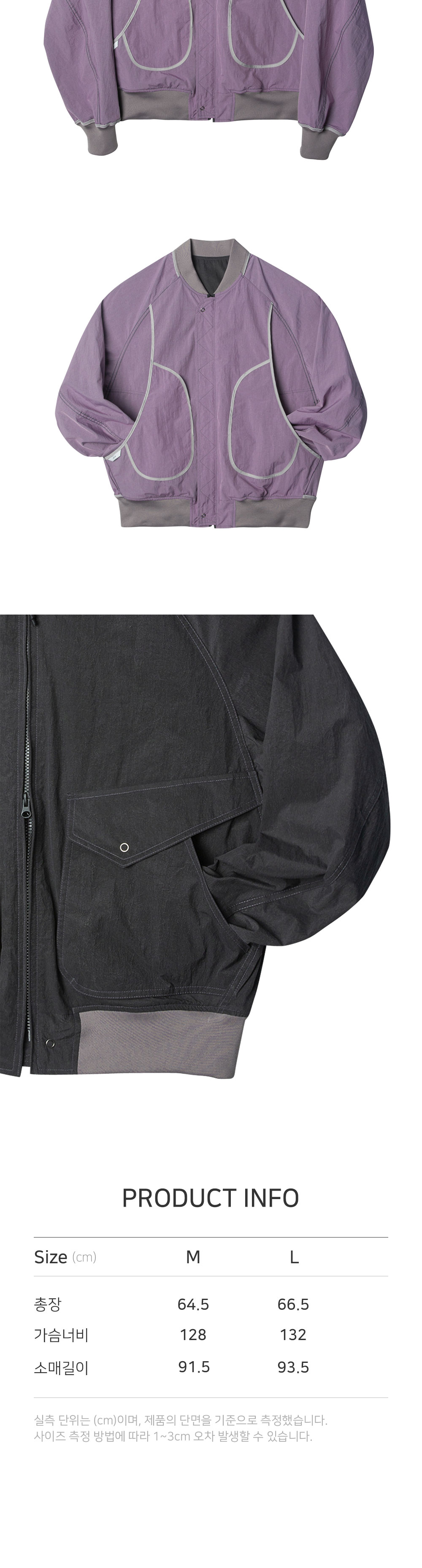 -홀겹으로 제작된 리버서블 타입의 디자인 -활동적인 팔의 움직임을 위한 래글런 슬리브 설계 -컴팩트한 기장과 넉넉한 루즈 실루엣 -이중 포켓 구조로 상단의 소지품 보관을 위한 입체 포켓과 사이드 포켓 -앞 섶 2-way 리버서블 지퍼와 플라켓 스냅 여밈 -넥라인과 소매밑단 립 디테일 -나일론 소재의 표면에 필름을 부착 후, 피그먼트 가공하여 투톤의 오묘한 색감이 특징