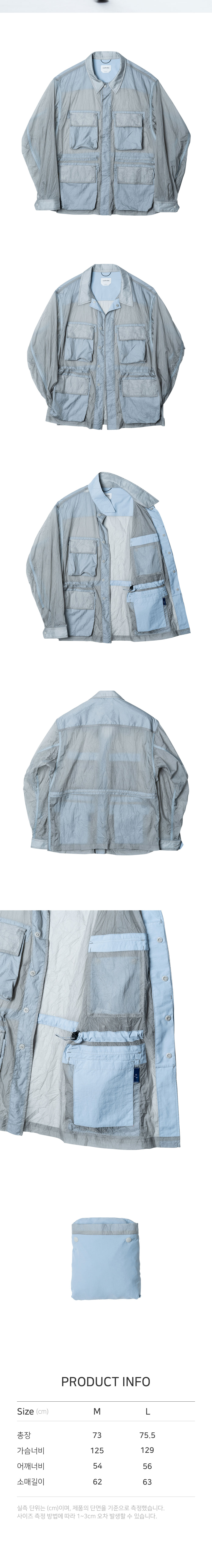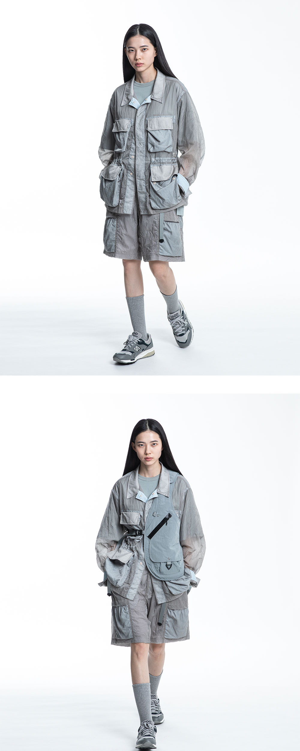 -B.D.U.의(전투복)의 매력적인 요소를 새롭게 해석한 디자인 -전면의 상징적인 입체 카고 포켓, 사이드 포켓, 인사이드 포켓 설계로 수납력 극대화 -컨버터블 칼라 디자인으로 단추를 여미거나 풀어서 연출 -허리 실루엣 조절이 가능한 스트링 어저스터 -래귤러 실루엣 -트라이 앵글 소매 패턴 설계로 편안한 활동성 제공 -가벼운 착용감을 위해 홑겹으로 제작 -절개의 모든 부위는 더블 스티치 처리하여 견고함을 더함 -솔기의 시접은 전체 바인딩 처리하여 제품의 완성도를 높힘 -경량 나일론(Yd/45g) 소재로 제작되어 가벼운 착용감과 하단의 부착된 포켓에 접어 넣어 휴대 용이 -주름 가공으로 입체적인 텍스쳐와 여름철 습기로 인해 달라붙는 현상을 완화 -비침이 있는 소재로 절개 부위는 배색하여 은은하게 비치는 컬러 블록은 경쾌한 움직임을 더함