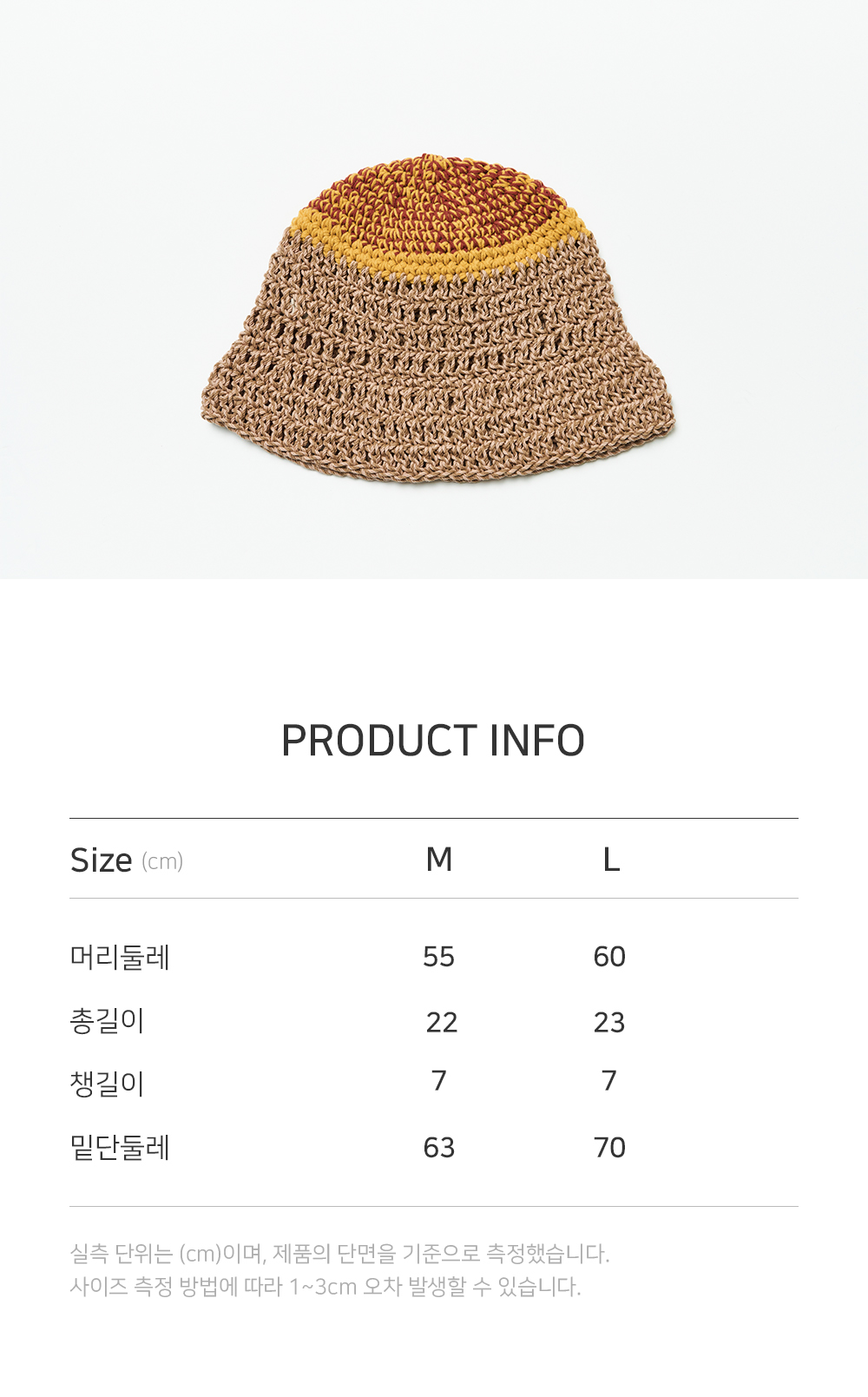니트짜임의 구조에 따라 제품 사이즈가 1~2cm 정도 차이 날 수 있습니다.