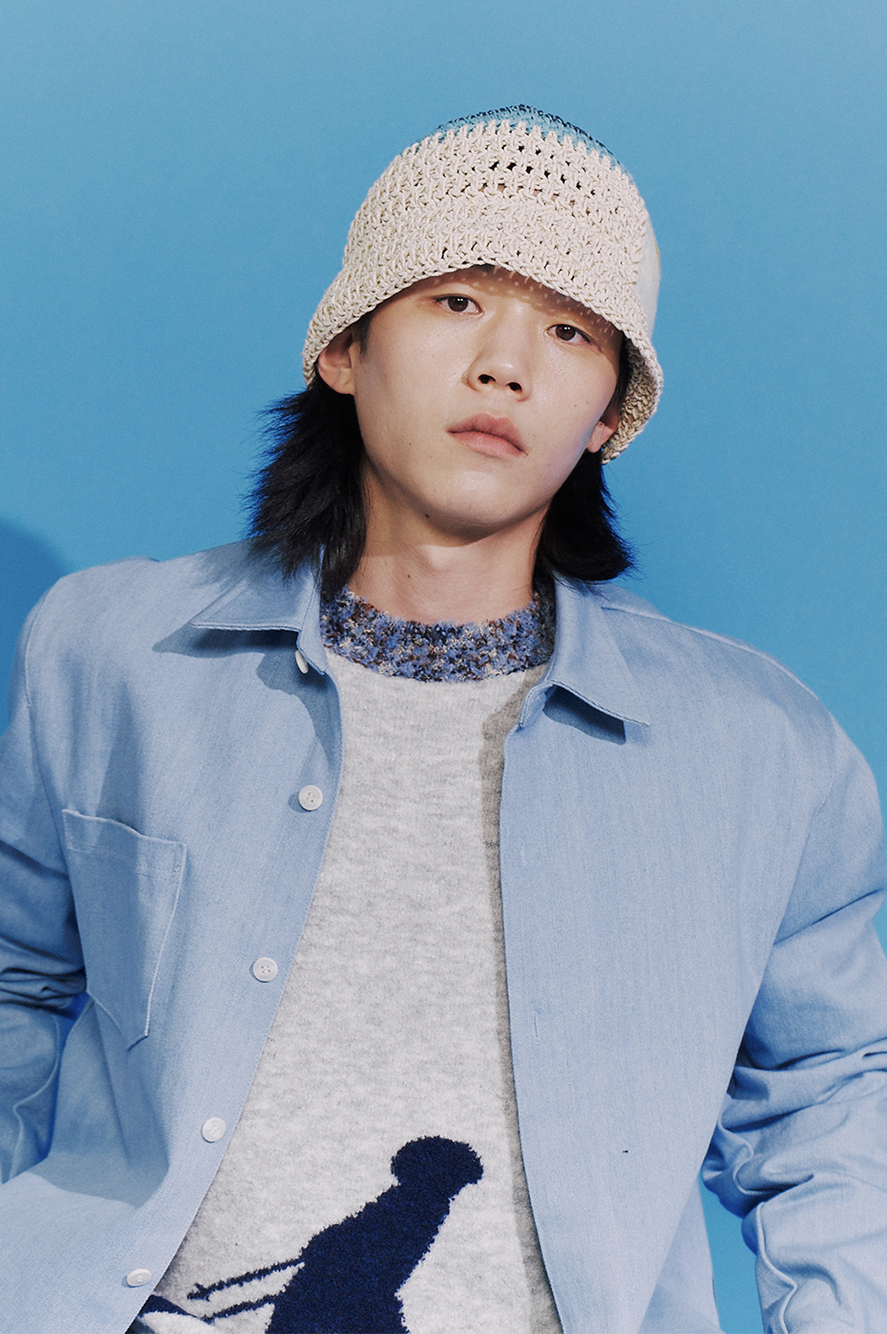 - 100% 핸드메이드입니다. - 미수아바흐브의 시그니처 버킷의 봄/여름 버전입니다. - 니트 패치를 핸드 스티칭 한 디테일이 포인트입니다. - 메탈릭한 실로 제작된 헤드 톱 부분과 바디 부분의 배색이 특징입니다.