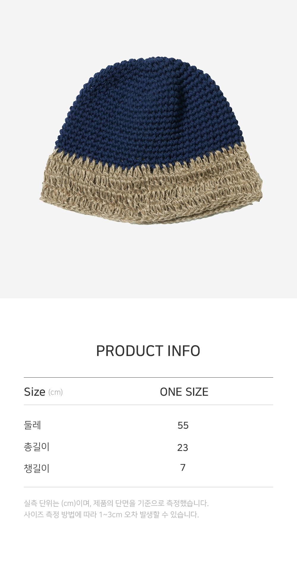 니트짜임의 구조에 따라 제품 사이즈가 1~2cm 정도 차이 날 수 있습니다.