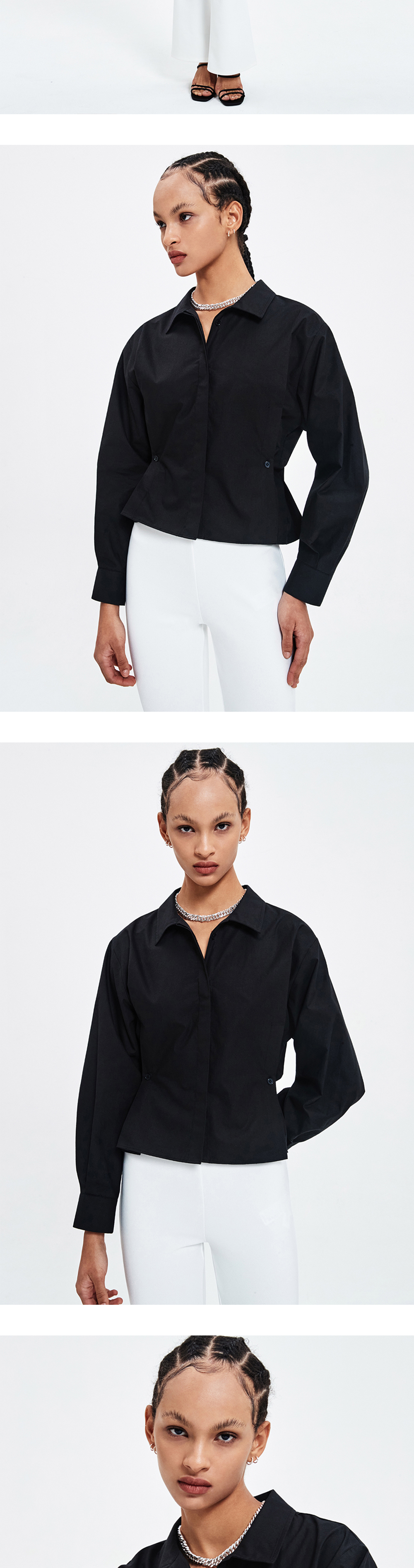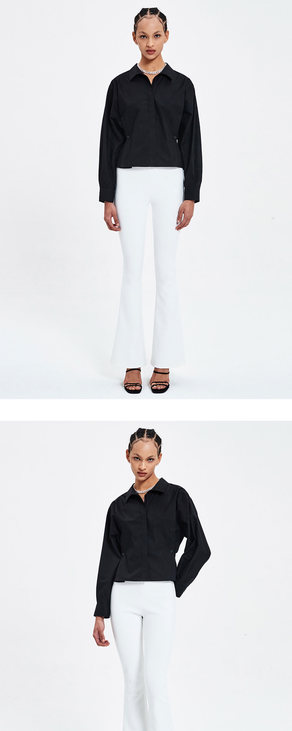 고밀도의 면 100% 원단을 사용한 스탠다드 핏 셔츠입니다. 양 사이드의 버튼 디테일로 스탠다드 핏과 슬림 핏, 2-WAY 타입으로 연출 가능합니다.