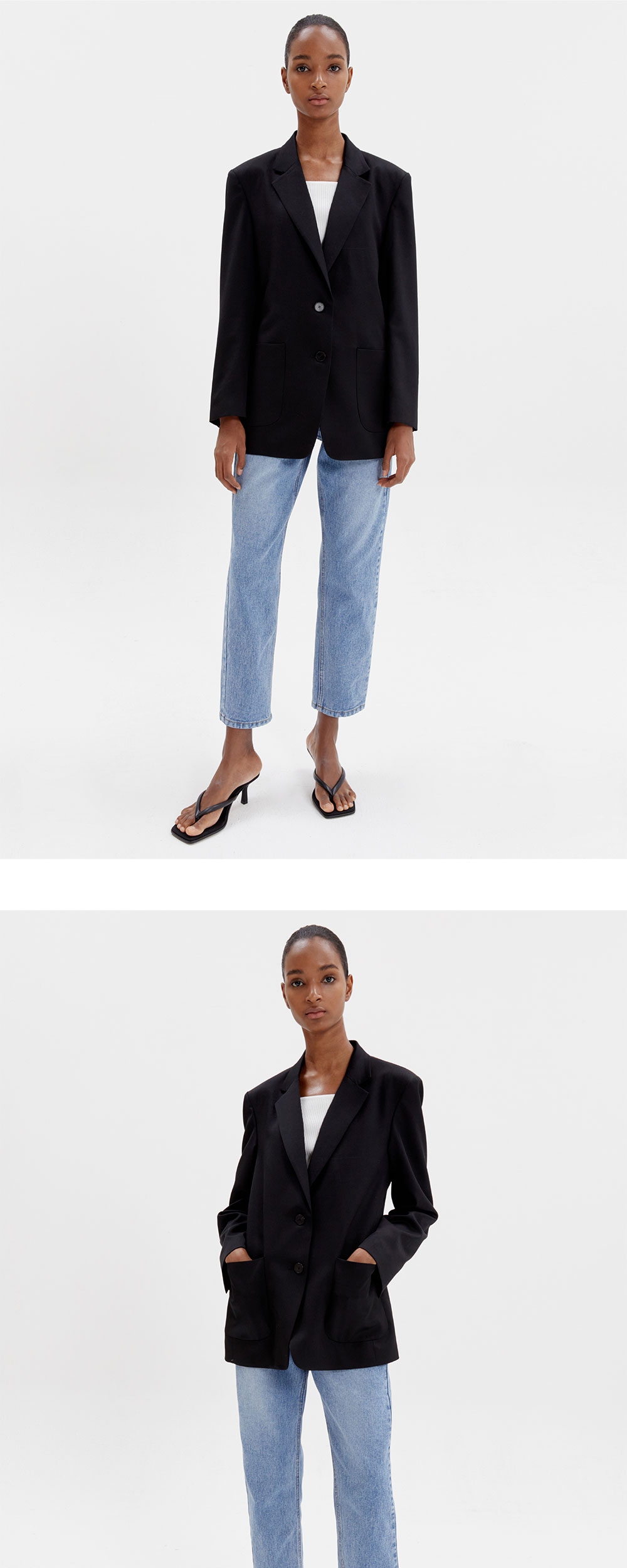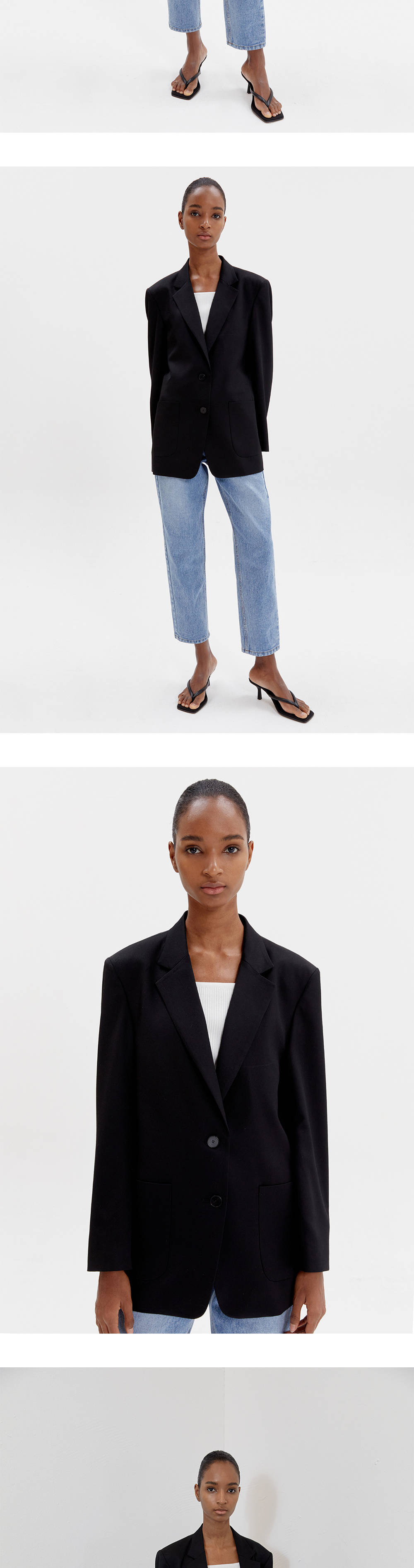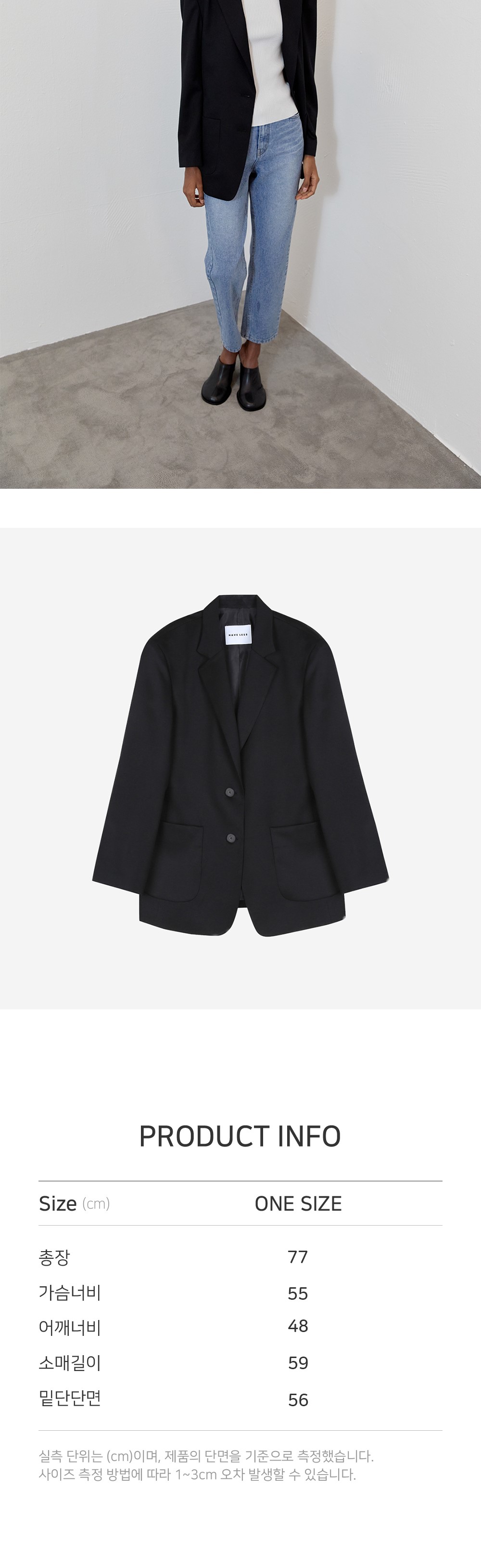 여름 원단의 WOOL 100% 함유랑으로 고급스러운 재질과 부드러운 착용감이 특징입니다. 매니시한 오버핏 실루엣으로 다양한 이너와 함께 착용 가능합니다. 프론트 2개의 견고한 소뿔 단추와 양 사이드의 아웃 포켓 디테일로 마무리 되었습니다.