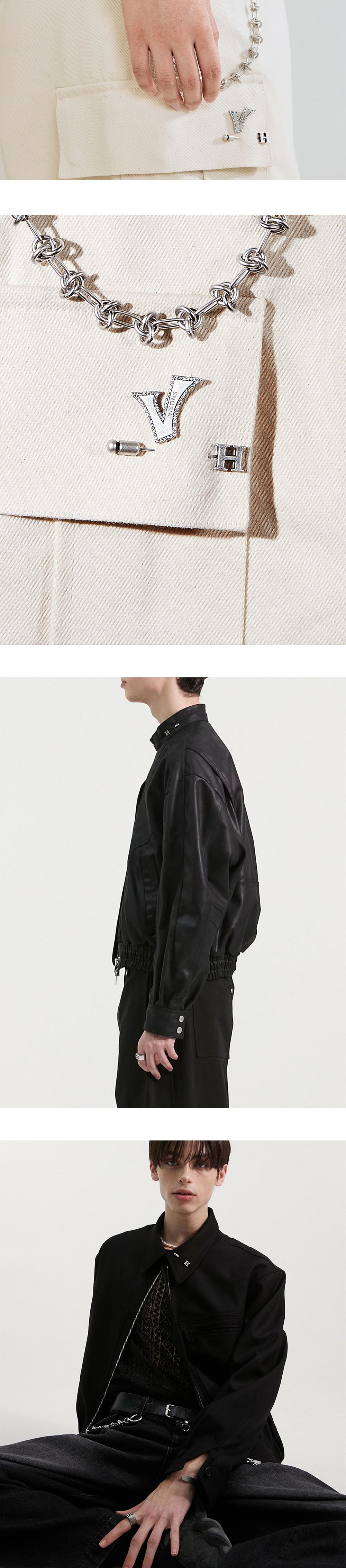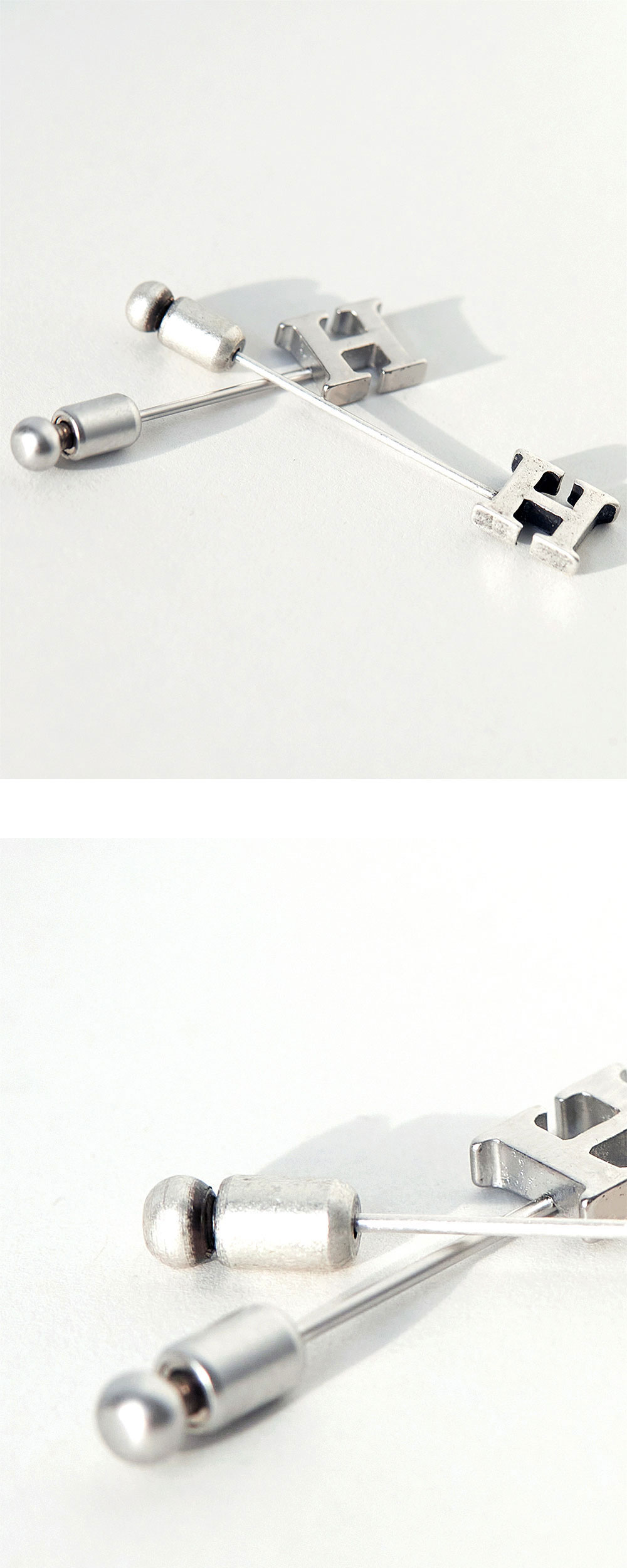 -타이 핀 형태를 차용한 디자인의 H 브로치입니다. -심플한 디자인으로 다양하게 포인트 주기 좋은 아이템입니다. -실버 타입과 엔틱 실버 두 가지가 한 세트로 구성되어 있습니다.