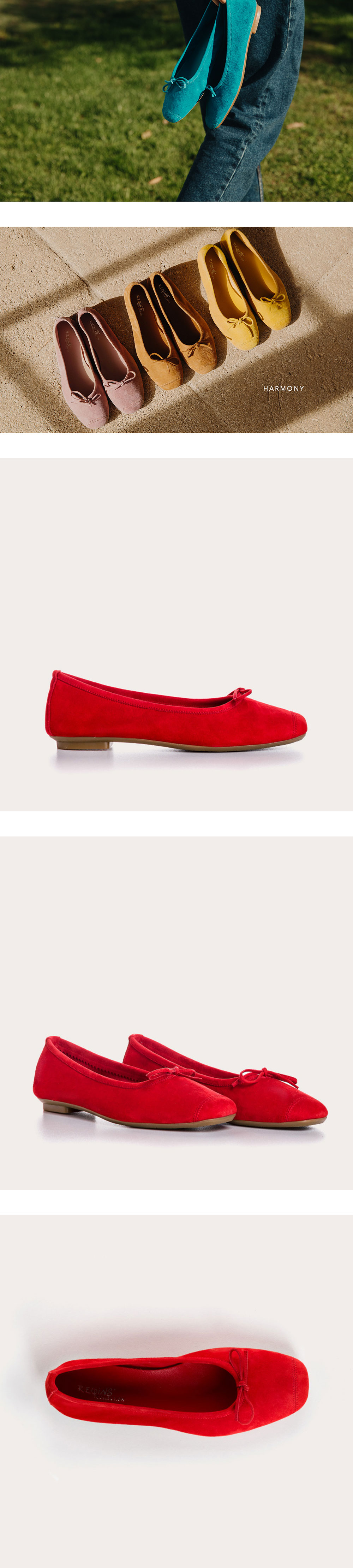 Reqins의 시그니처 모델인 Harmony모델입니다. 연하고 부드러운 가죽이 특징으로 신었을때의 착화감이 좋은 것은 물론이고 페미닌한 무드의 핏감으로, 발레리나 슈즈를 연상시키는 슈즈입니다. 정사이즈로 나왔으며, 소재 특성상 늘어남이 있습니다. [사이즈 가이드] 35=225~230 36=230~235 37=235~240 38=240~245 39=245~250 40=250~255 [취급 시 주의사항] * 얼룩이 생겼을 경우 가죽 전용 클리너로 닦아주세요. * 첫 시착시 스웨이드 부분의 묻어남이 있을 수 있으니, 가급적이면 흰색 양말은 피해주세요. * 형태를 유지하기 위해서 신문지를 넣어두면 오랜 기간 신을 수 있을 수 있습니다. * 스웨이드 부분의 이염은 스웨이드 전용 세척제를 이용해 닦아주세요. * 가죽 신발 보관 시에는 온도와 습도가 낮고 바람이 잘 통하는 곳에 보관해 주세요. * 물에 닿았을 경우 신문지를 넣어 습기를 제거하고, 그늘에서 말려주세요.