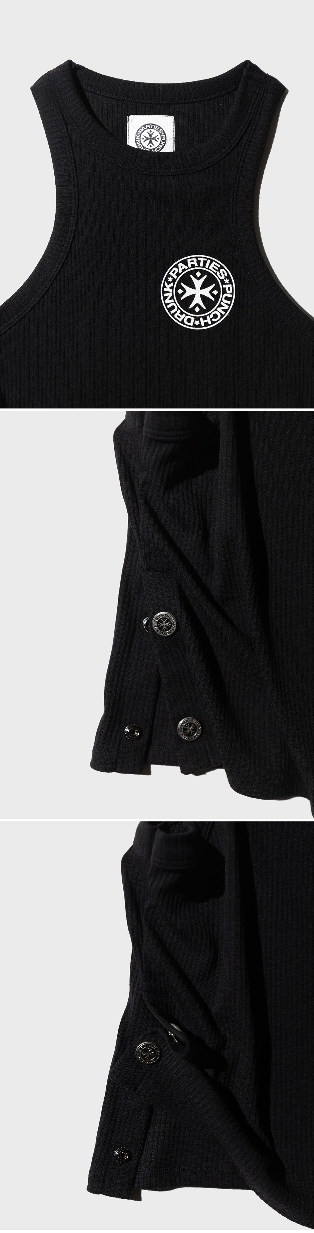 63% Poly, 33% Rayon, 4% Span, Slit-Button Detail 63% 폴리, 33% 레이온, 4% 스판, 절개-버튼 디테일 여성전용 제품이며, 여름의 빈 캔버스 같은 제품을 만들고 싶었습니다. 레귤러한 실루엣에 폭이 넓은 골지 원단을 사용했고 홀터 스타일로 좁게 치고 올라가는 넥라인과 볼드한 기본 로고, 금속 부자재의 조합으로 자리와 장소, 스타일에 관계없이 어울립니다. 하단의 절개-버튼 콤비네이션은 슬릿 (Slit) 스타일의 연출은 물론, 엇갈린 버튼 체결로 기장을 끌어올리는 등의 다양한 연출이 가능합니다. 수준높은 터치감에 얕고 넓은 골을 가진 원단은 착용을 거듭할수록 낮은 퀄리티의 원단과 다른 신축의 형태를 가지며 전체적인 핏과 나염의 위치가 사용자의 체형에 맞게 빠르게 맞춰집니다.