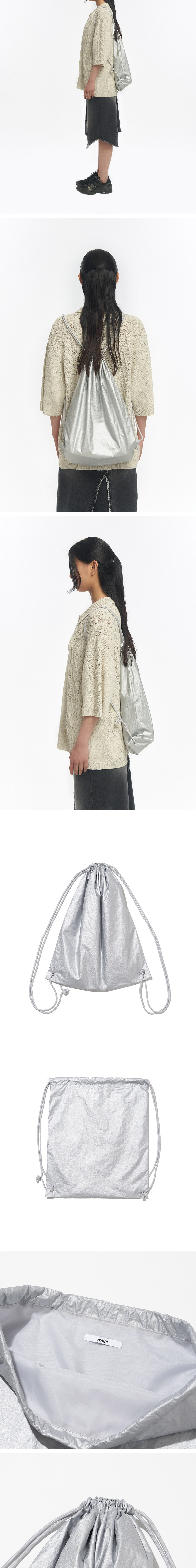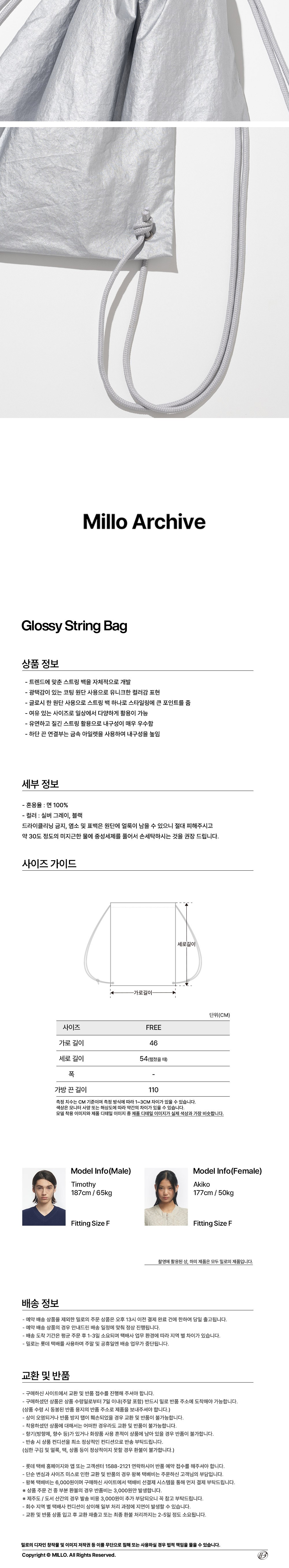 -트렌드에 맞춘 스트링 백을 자체적으로 개발 -광택감이 있는 코팅 원단 사용으로 유니크한 컬러감 표현 -글로시한 원단 사용으로 스트링 백 하나로 스타일링에 큰 포인트를 줌 -여유있는 사이즈로 일상에서 다양하게 활용이 가능 -유연하고 질긴 스트링 활용으로 내구성이 매우 우수함 -하단 끈 연결부는 금속 아일렛을 사용하여 내구성을 높임 -Model Info 남자모델(티모시): 187cm / 65kg FREE SIze 착용 여자모델(아키코): 177cm / 50kg FREE SIze 착용