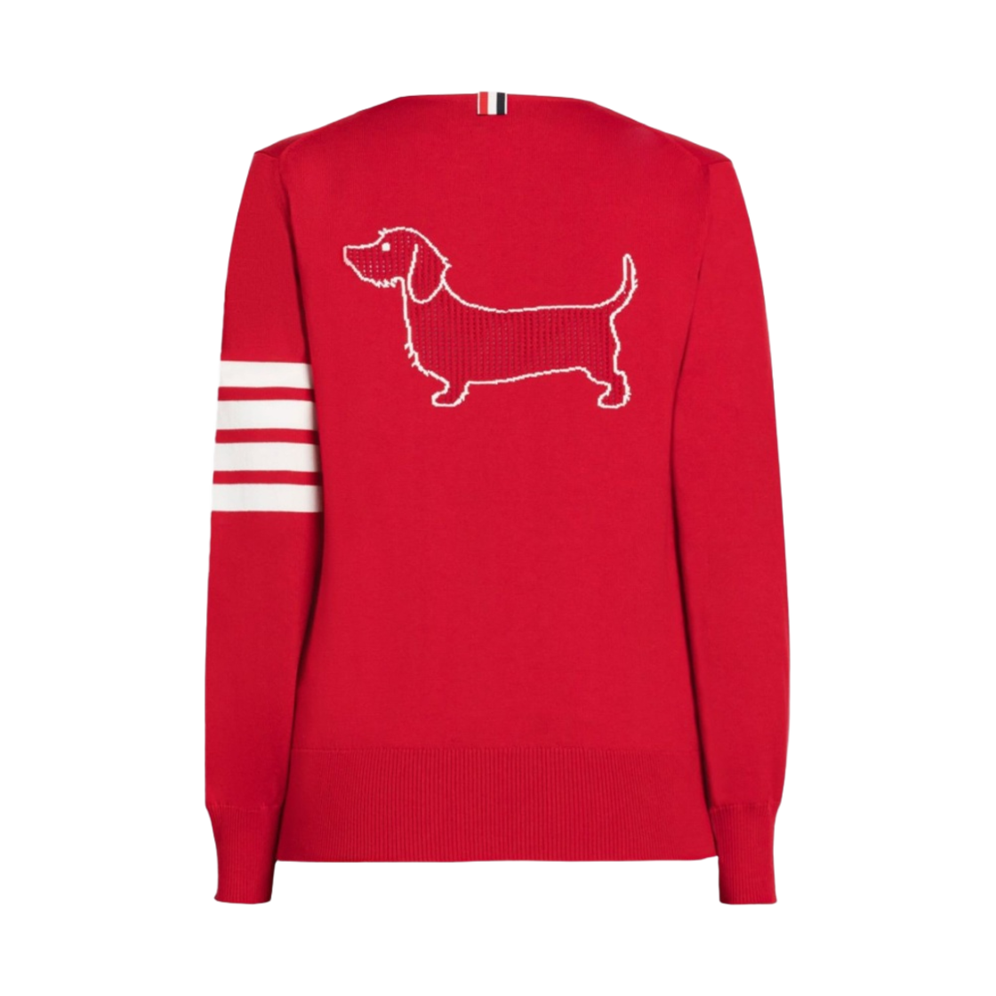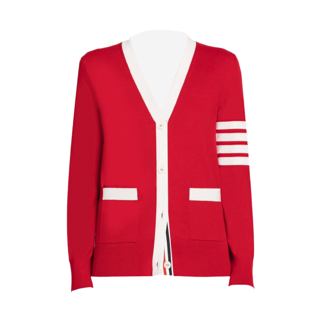 (W) Thom Browne Cotton Hector Pointelle 4-Bar V-Neck Cardigan Red