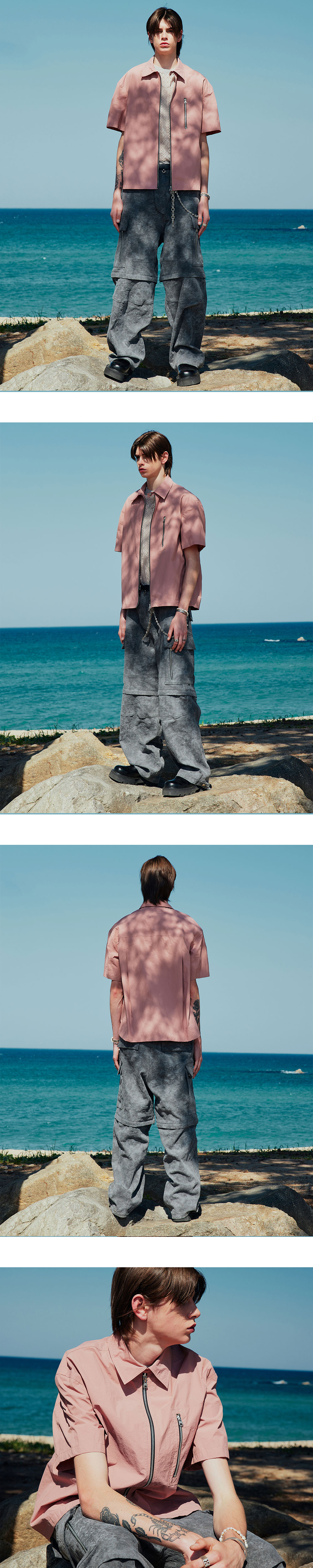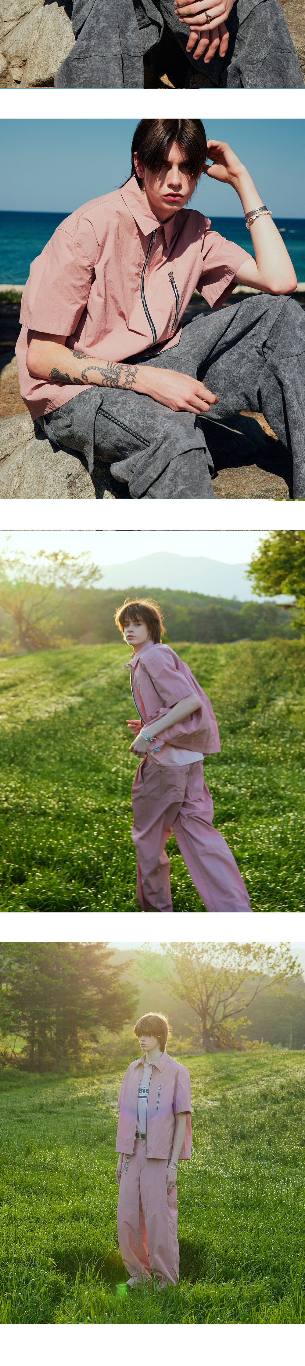 페이퍼 가공 처리된 친환경 리사이클 나일론 소재로 제작되어 바스락거리는 재질감을 표현했습니다. 카펜터 디테일을 차용한 하프 슬리브 자켓이며, 여유 있는 품에 크롭한 기장감으로 편하게 입기 좋은 제품입니다. 매우 얇은 소재로 한 여름철까지 착용 가능합니다. -언발란스 지퍼 포인트의 카펜터 디테일의 5각형 포켓 -등판 투 플리츠 디테일 -카라 스냅 비죠 디테일