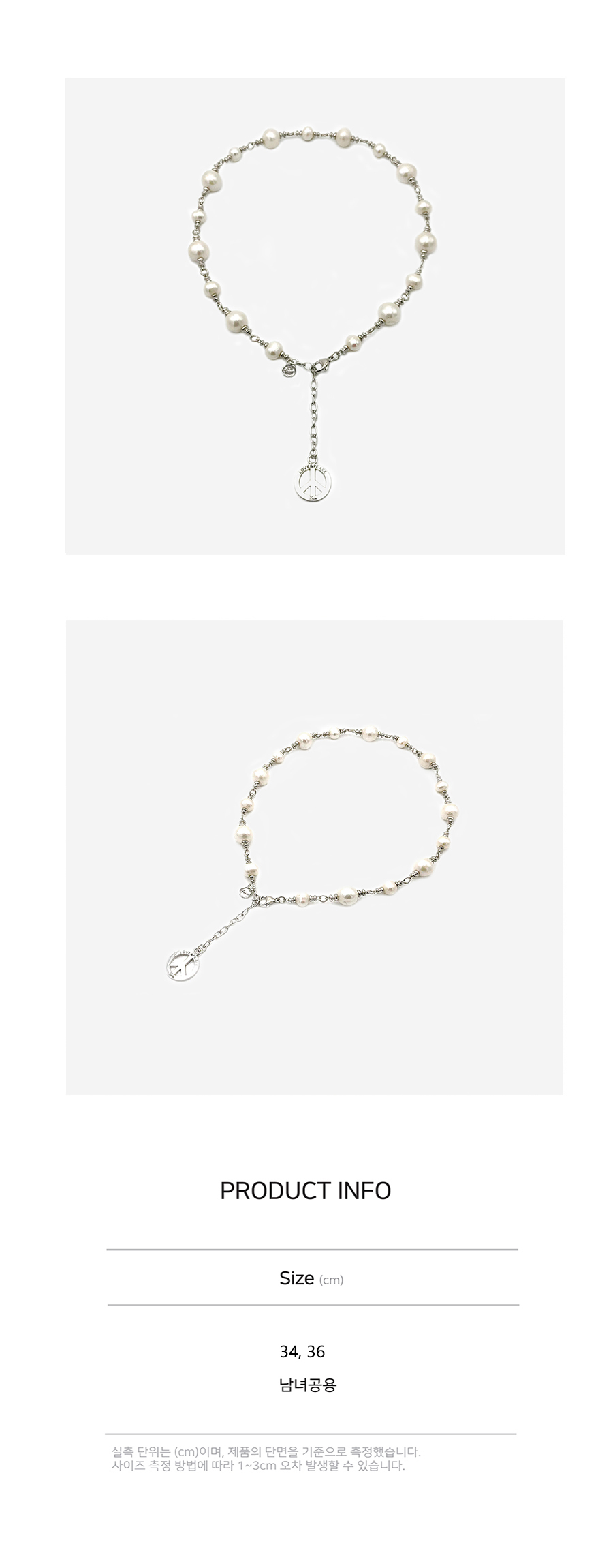 두 가지 사이즈의 진주로 구성되어 우아함을 더했으며 피스 팬던트로 유니크함을 담은 제품입니다.