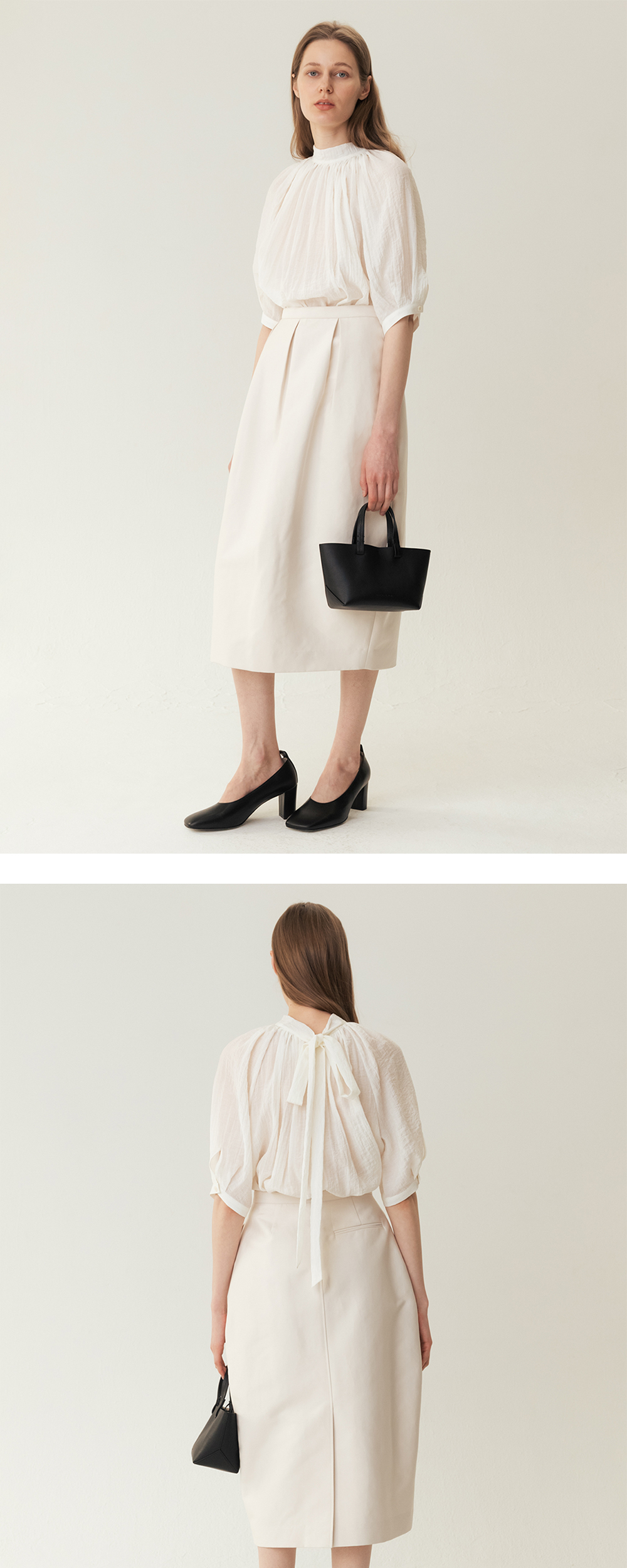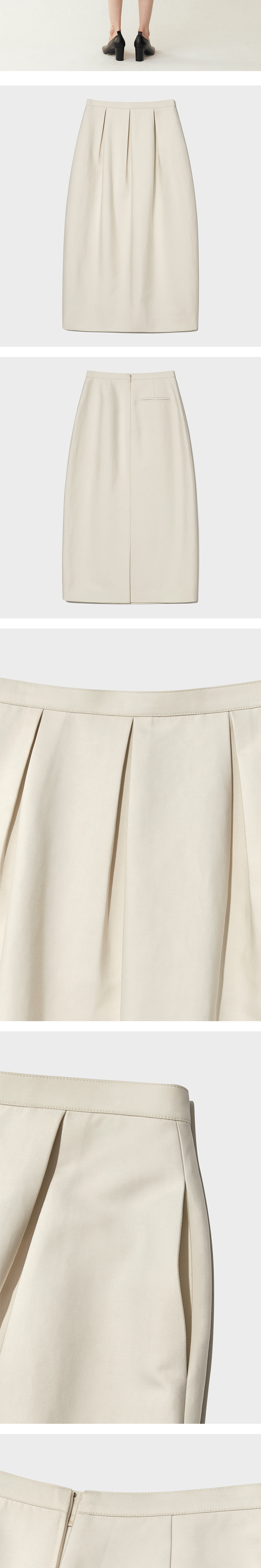 하이라이즈 웨이스트 아래로 볼륨감 있는 튤립 실루엣을 그리며 길게 내려오는 매력적인 스커트입니다. 3개의 턱 디테일으로 구성되어 더욱 풍성하게 연출되는 실루엣이 우아함을 자아냅니다.
