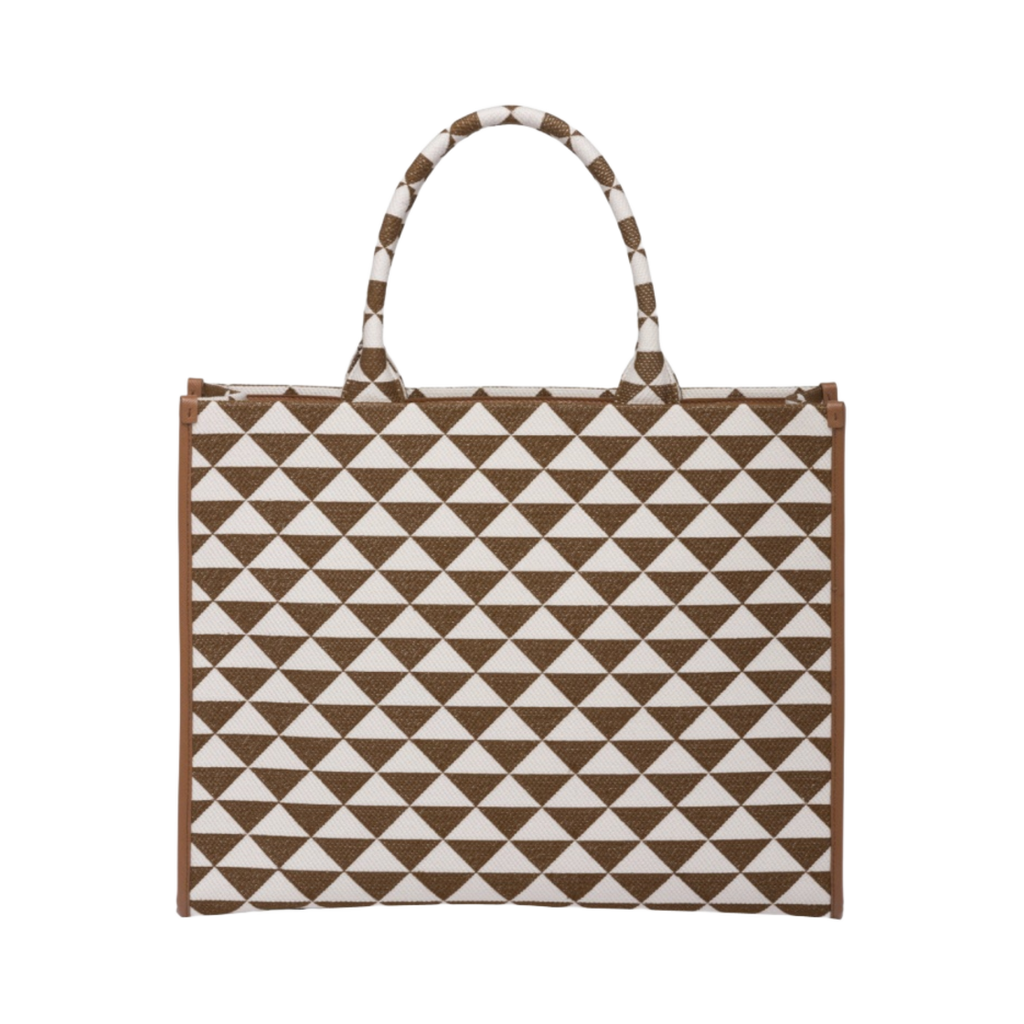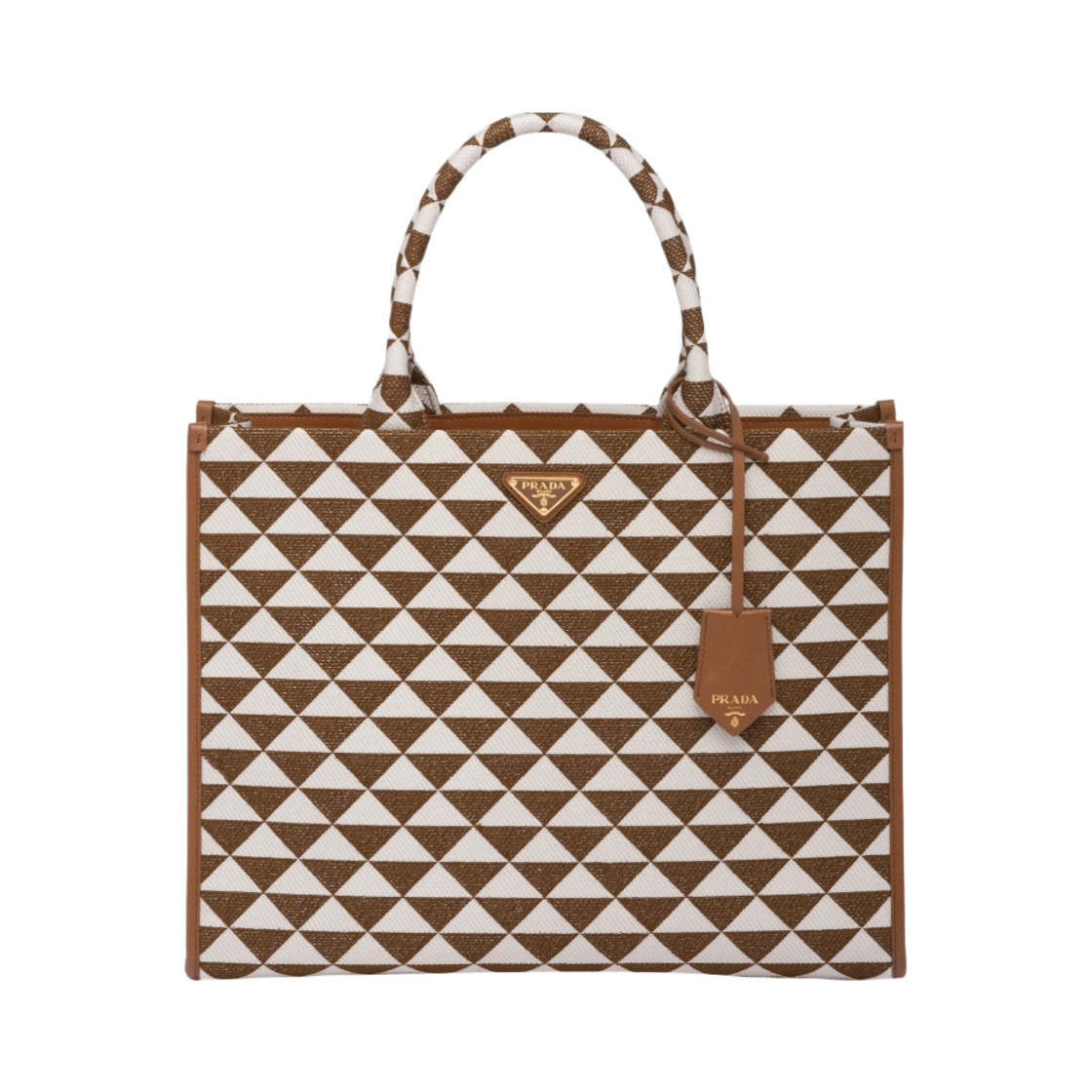Prada Large Prada Symbole Embroidered Fabric Handbag Tobacco Chalk White