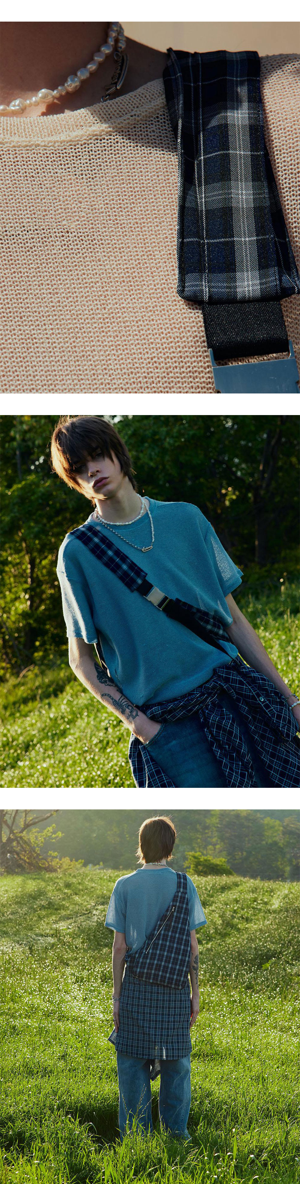 폴리에스테르 체크 소재로 제작된 소재로 제작된 슬링백입니다. 휴대폰/지갑/작은 소지폼 동시 수납 가능한 사이즈로 실용성도 좋습니다. -DETAIL- 1.4겹으로 끈을 입체적으로 디자인 2.나일론 끈으로 두 줄 레이어드 처리 3.스크래치 가공 처리된 볼드 한 금속 장식 4.끈 하단/벨트 고리 가죽으로 별도 제작 5.지퍼 고리 가죽으로 별도 제작