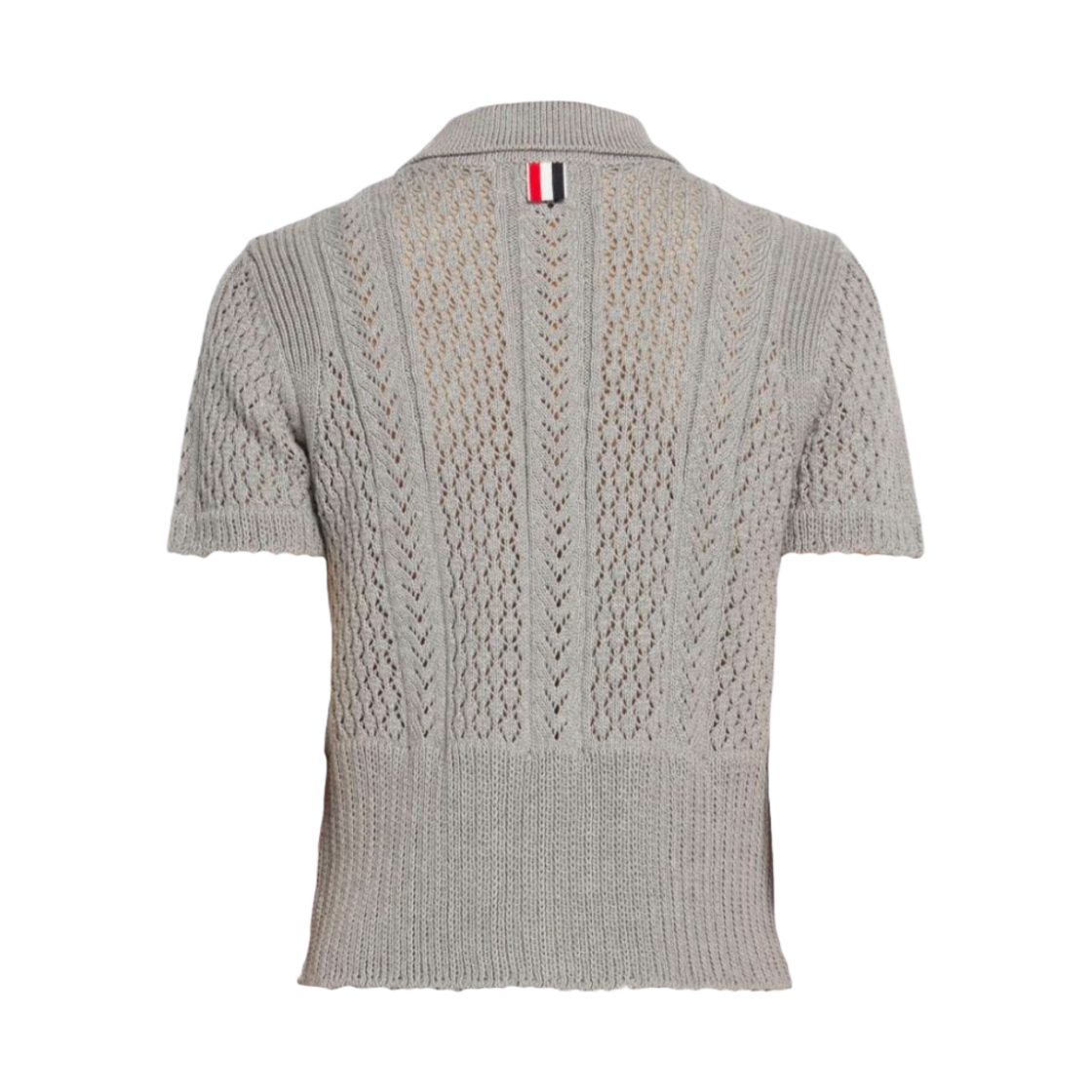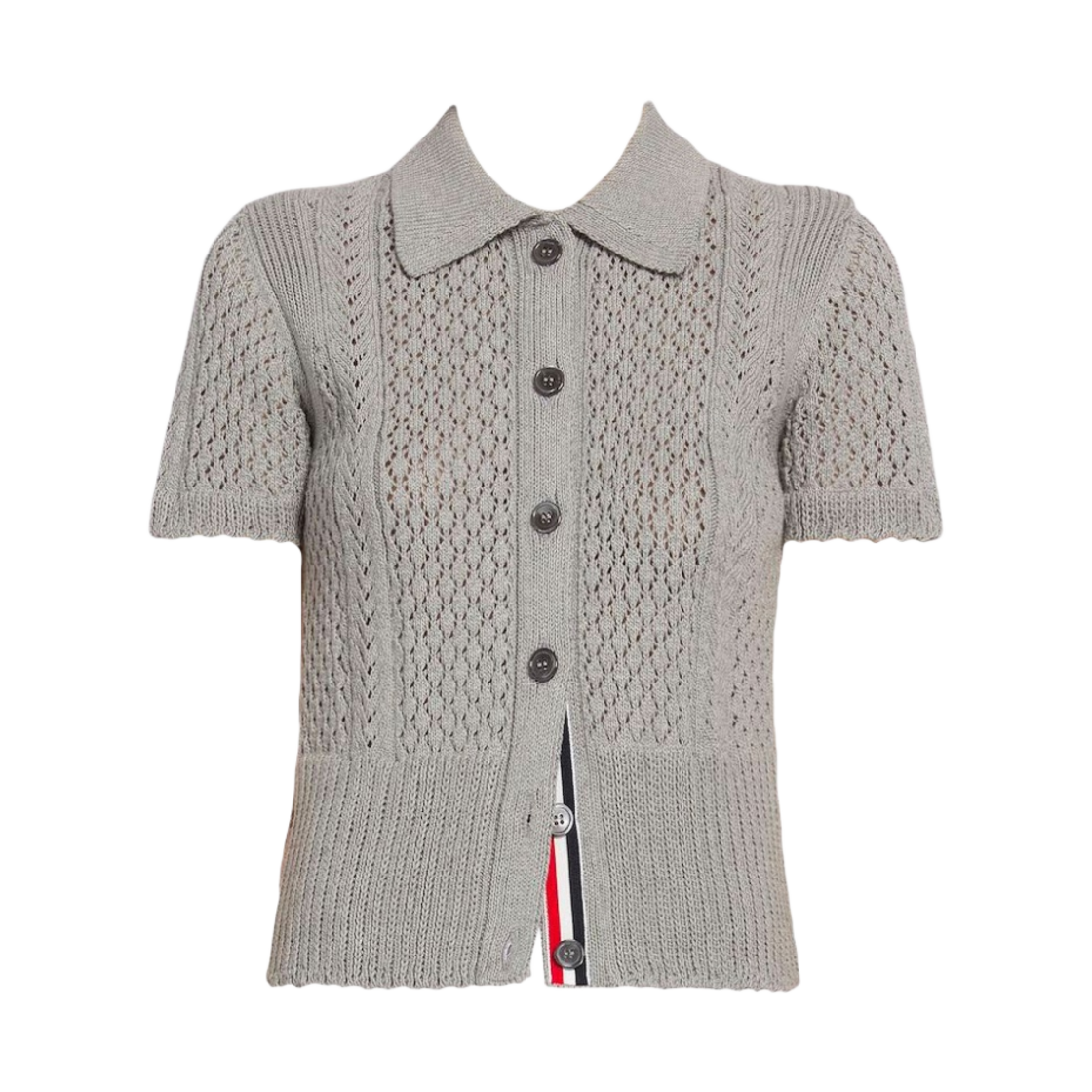 (W) Thom Browne Cotton Mixed Pointelle Cable Knit Short Sleeve Polo Cardigan Light Grey