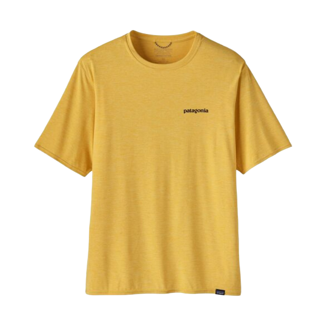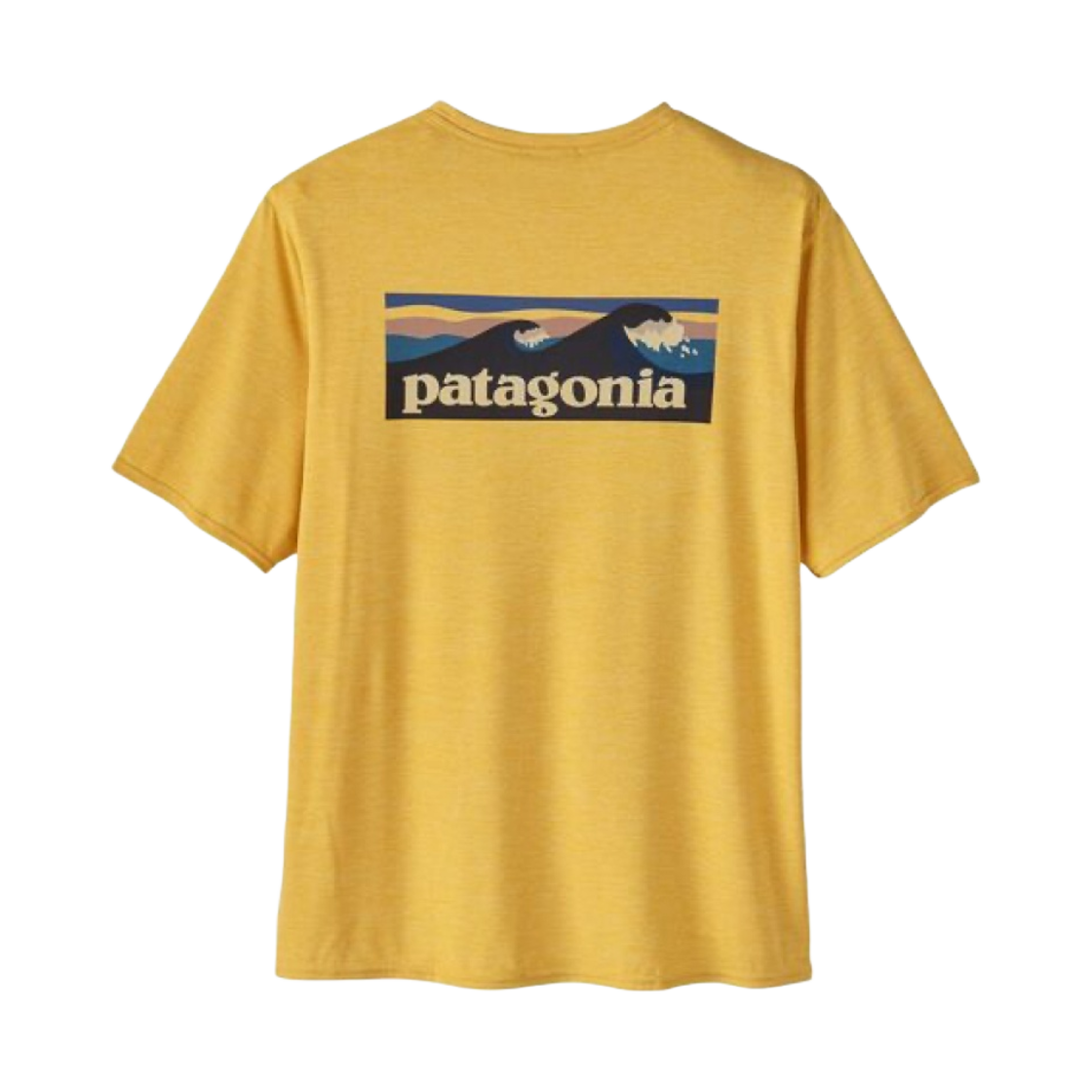 Patagonia Capilene Cool Daily Graphic T-Shirt Waters Boardshort Logo Surfboard Yellow X-Dye