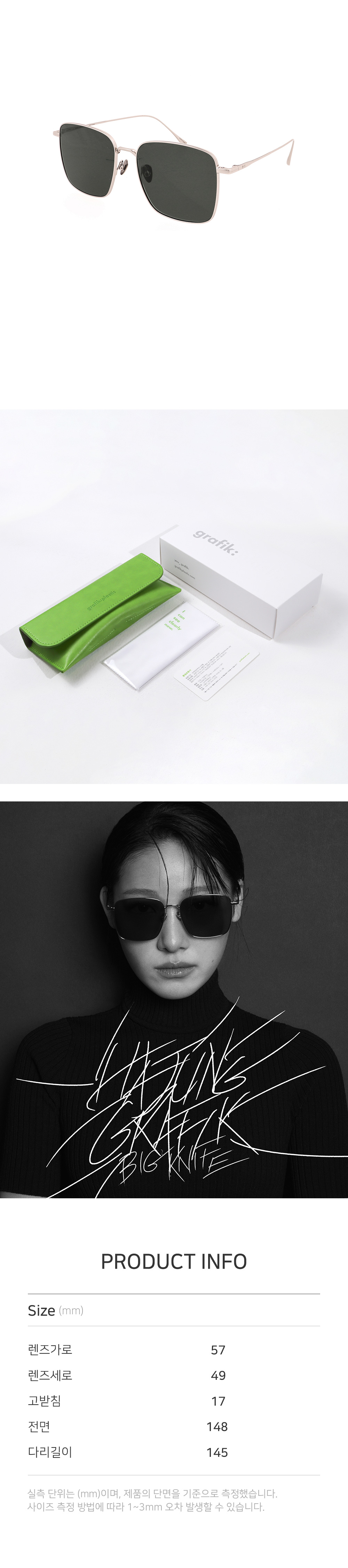 오버사이즈 제품으로 안경과 선글라스 겸용으로 출시 되었습니다. 안경으로는 레트로한 무드를, 선글라스로는 세련된 느낌을 주는 제품입니다. *기본 장착된 안경 렌즈는 블루라이트 차단 렌즈입니다. 선글라스 렌즈는 제품과 함께 발송드립니다.* [제품 발송은 커스텀 본사와 물류창고 2곳에서 진행 됩니다. 모두 동일한 제품이오니 참고 부탁드립니다.]