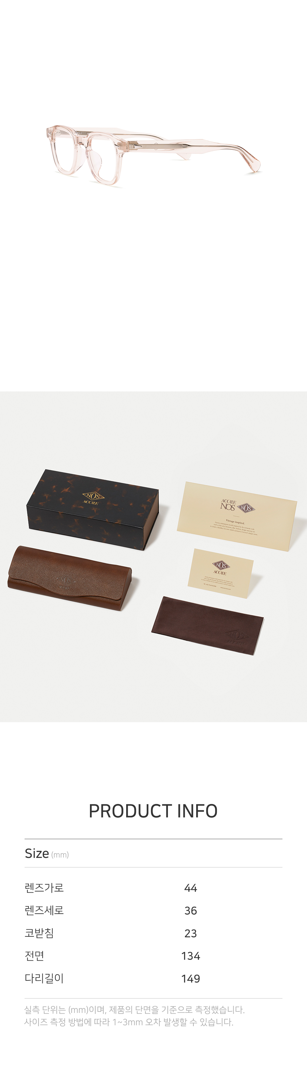 ACCRUE NOS(New old stock)는 “Vintage Inspired.” 캐치프레이즈 아래, 오랜 시간 동안 잠들어있던 과거의 오리지널리티를 그대로 재현하고, 그 속에서 새로운 가치를 창조하는 것을 목표로 합니다. NOS-01 모델은 빈티지 안경의 제왕으로 불리는 아메리칸 보스턴 스타일을 베이스로 디자인되었습니다.