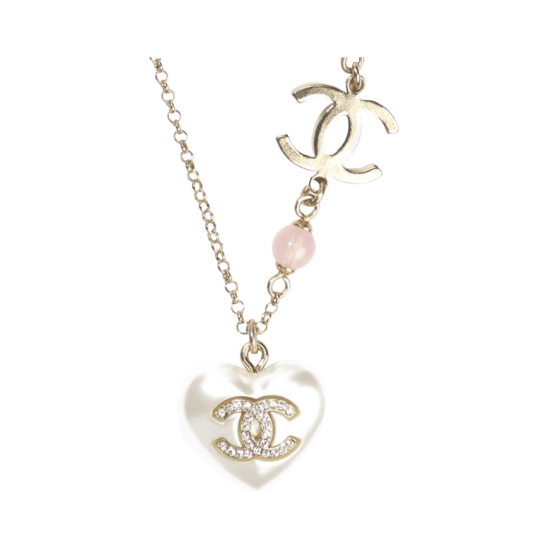 (W) Chanel Necklace Metal Resin Glass Pearls & Gold Pink Pearly White