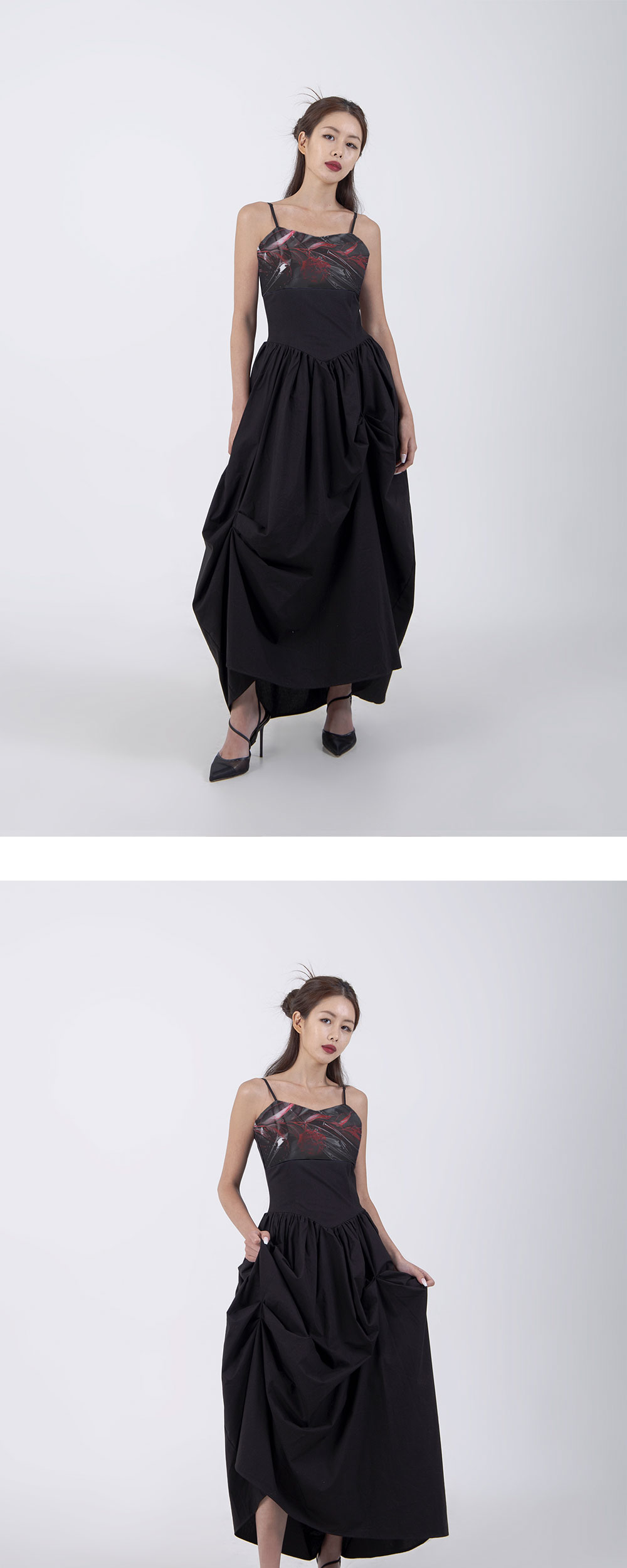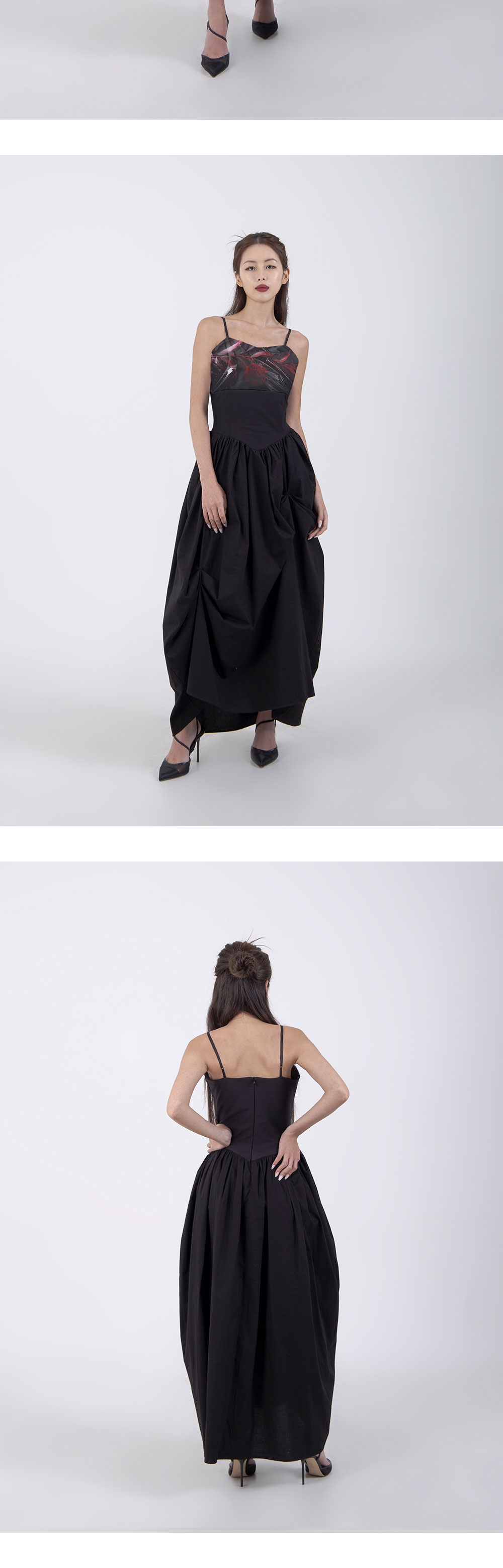 달링유어배드 우먼 언발란스드 셔링 롱 드레스 블랙