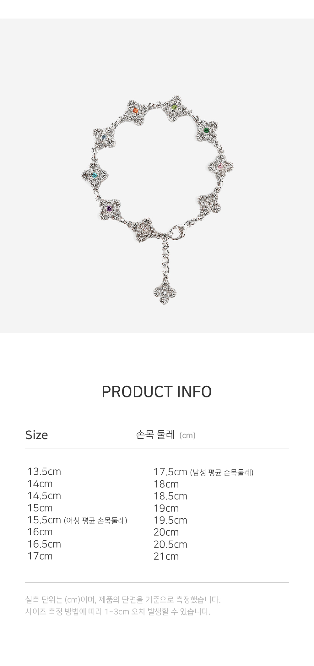 [blossom shell flower line] 바다의 조형적인 꽃인 조개를 모티브로 디자인된, 쉘 플라워 라인 -pendant size bold : 13mm -color : multi color (이미지 컷 컬러) * 착용하실 손목둘레(cm)를 측정해 주시고 , 손목둘레를 기준으로 옵션을 선택해 주시면, 정핏으로 제작드립니다. * 옵션에 없는 손목둘레 또는 원하시는 핏이 있으시다면 , 문의 남겨주시면 , 상담 도와드리겠습니다. 스쿠도의 주얼리는 맞춤 handcraft 주얼리로, 7~10일 제작기간이 소요됩니다. (주말 / 공휴일 제외) 추가 제품 상담이 필요하시면, 문의 부탁드립니다.