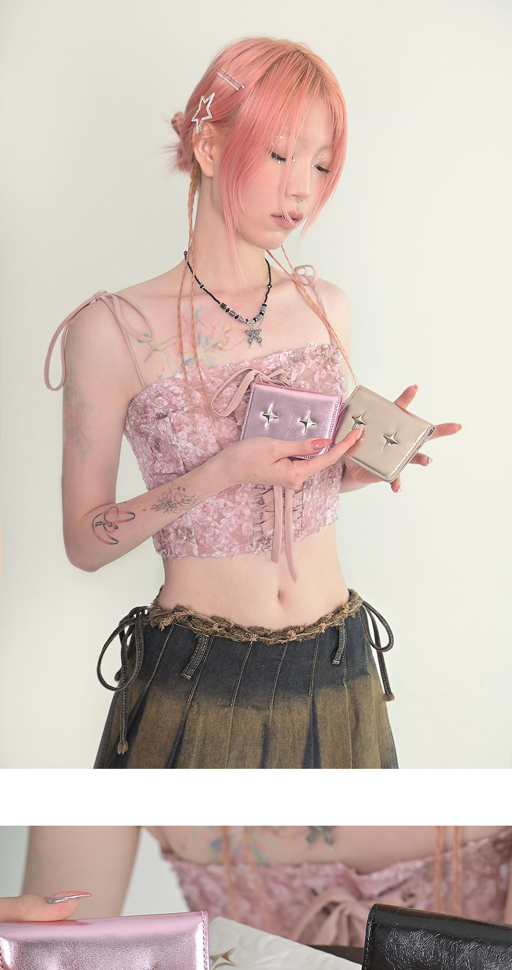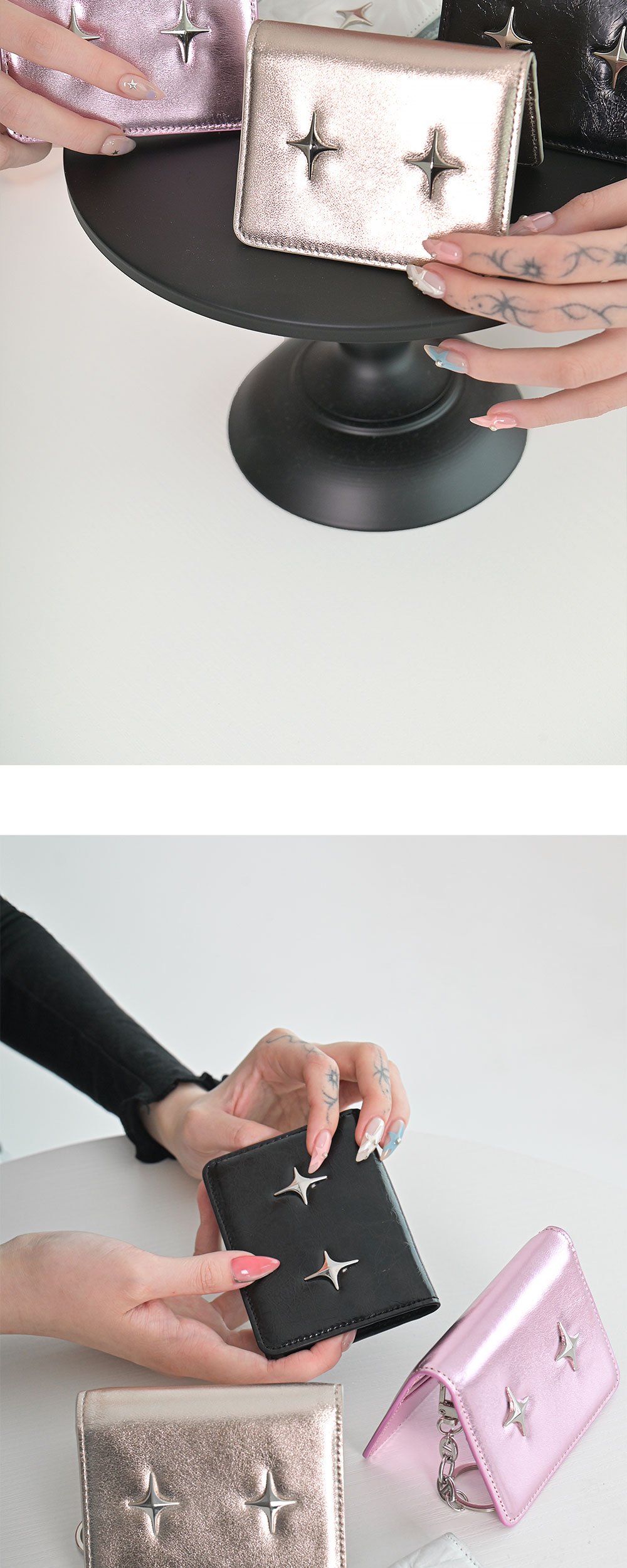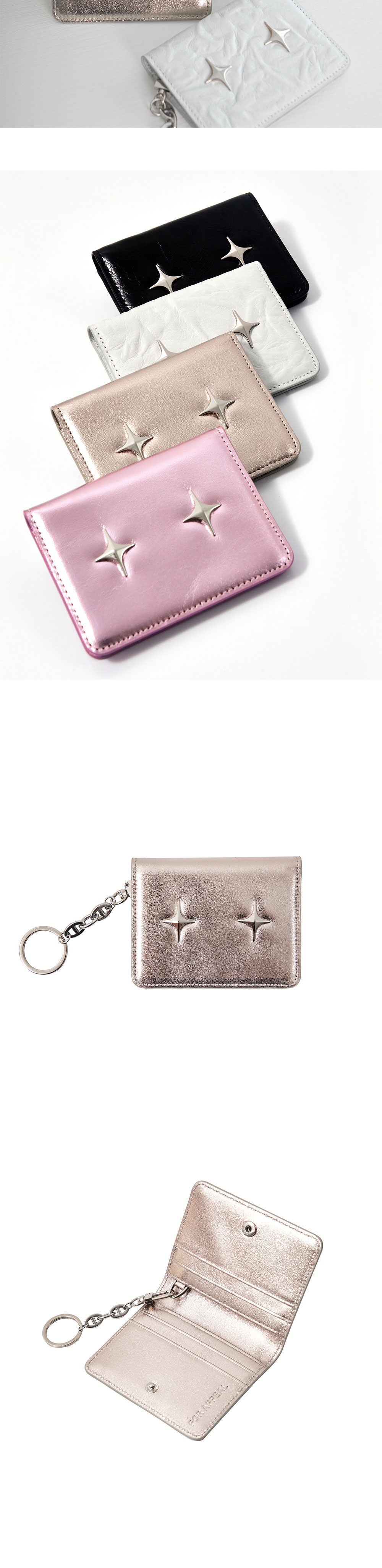 포어필의 'sparkle star’ 라인의 카드지갑 입니다.한 손에 잡히는 컴팩트한 사이즈와 ’sparkle star’ 팬던트 장식이 특징입니다. 6개의 카드포켓이 있어 자주 쓰는 카드 등의 수납이 용이합니다. 탈부착이 가능한 써지컬 스틸 키링이 제공됩니다. 박스 패키징 구성으로 선물하기에 용이합니다. 메탈 실버 컬러는 특수 호일과 염료를 이용하여 글라시한 광택이 살아있도록 가공한 소가죽 입니다. 전체적으로 실버톤에 골드가 아주 미세하게 섞인 샴페인 실버 컬러로, 빛에 따라 오묘한 색감을 지닙니다.