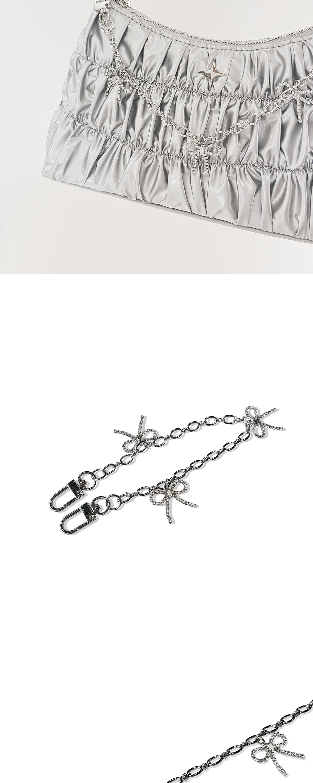 ‘sparkle star’ 컬렉션 라인의 백참입니다. 리본 팬던트와 체인을 레이어드한 사랑스러운 백참입니다. 가방이나 팬츠에 포인트로 매치하기 좋은 아이템 입니다. 강한 내구성, 알러지 없음, 고급스러운 질감과 고유의 광택이 처음과 같이 오래도록 유지되는 것이 써지컬스틸의 장점입니다.