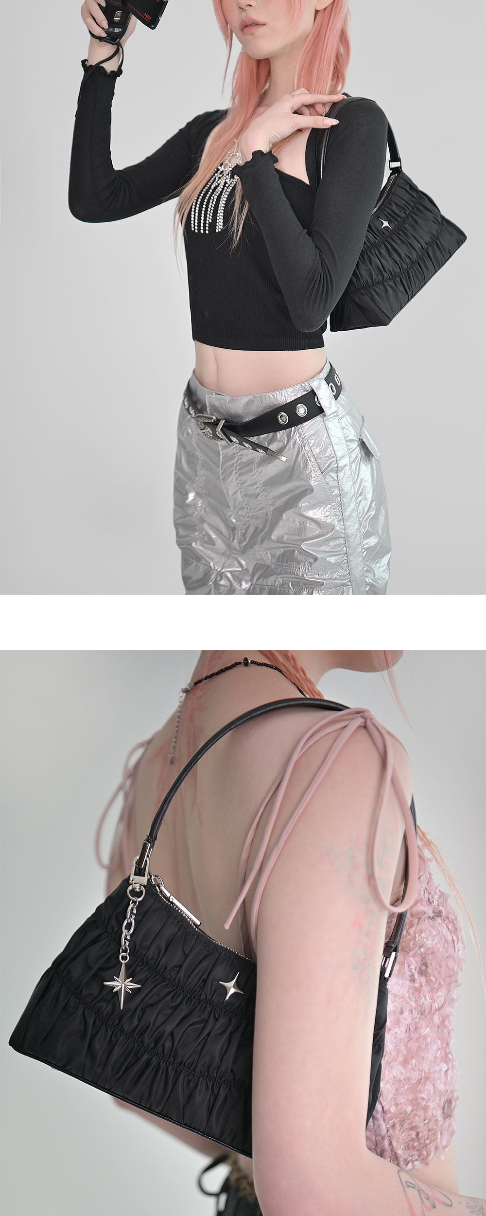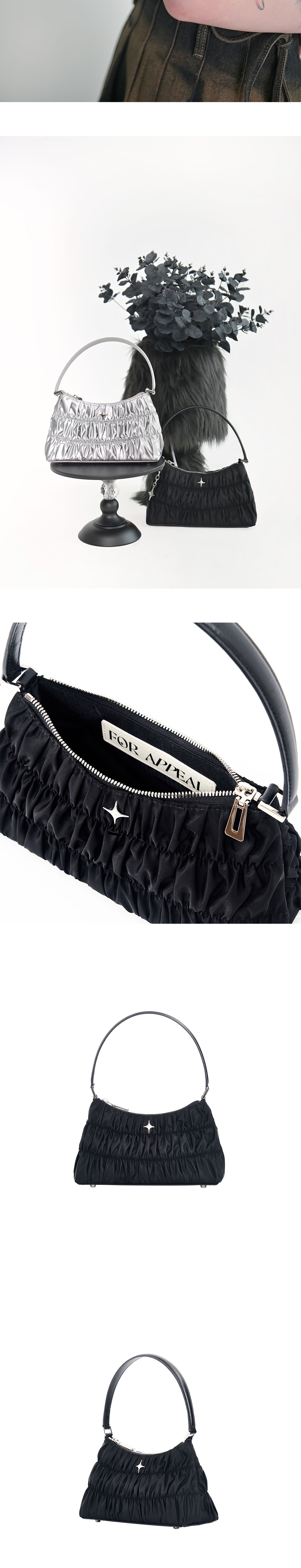 포어필 ‘sparkle star’ 라인의 셔링 호보백 입니다. 가벼운 나일론 소재를 몸판에 사용하여 부드러운 터치감과 생활 방수가 특징입니다. 숄더로 사용할때 무겁지 않게 최적의 사이즈를 구상하였습니다. 손잡이와 밑판에 사용된 에나멜 소가죽은 불규칙하고 자연스러운 엠보가 특징입니다. 밑판에 스터드 장식이 있어 마찰에 의한 손상이 적으며 안정적 입니다. 가방 안쪽에 작은 포켓이 있어 따로 카드,명함,등 수납이 가능합니다. YKK지퍼, 니켈 장식으로 고급스러움을 한층 더해주었습니다.