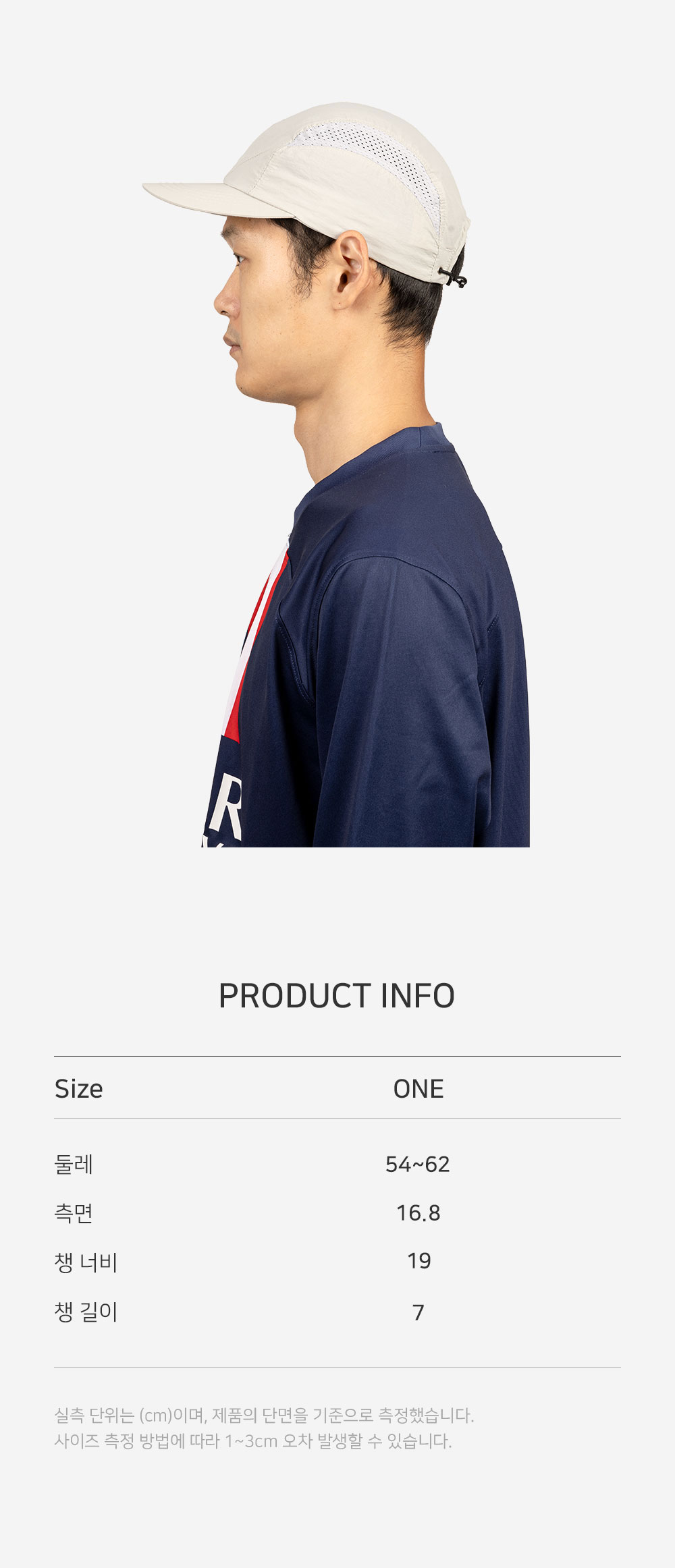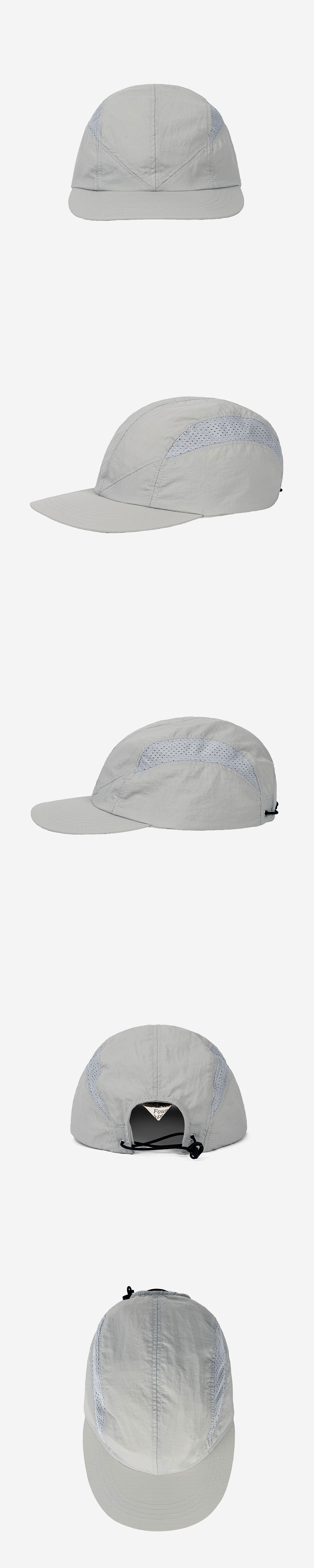 PRODUCT: CAP COLOR: LIGHT GREY SIZE: ONE SIZE (54 - 62cm) OUTSHELL: NYLON 100% LINING: NYLON 100% PRICE: 58,000 KRW - 가볍고 가볍고 가벼운 캠프 캡 - 메쉬 패널을 적용해 열 배출에 용이 - 립 스탑 원단 중 부드러운 촉감으로 사용 - 지그재그 형식의 E-스트링을 사용한 사이즈 조절 및 고정 - 뛰어난 퀄리티의 우진 플라스틱 부자재 사용