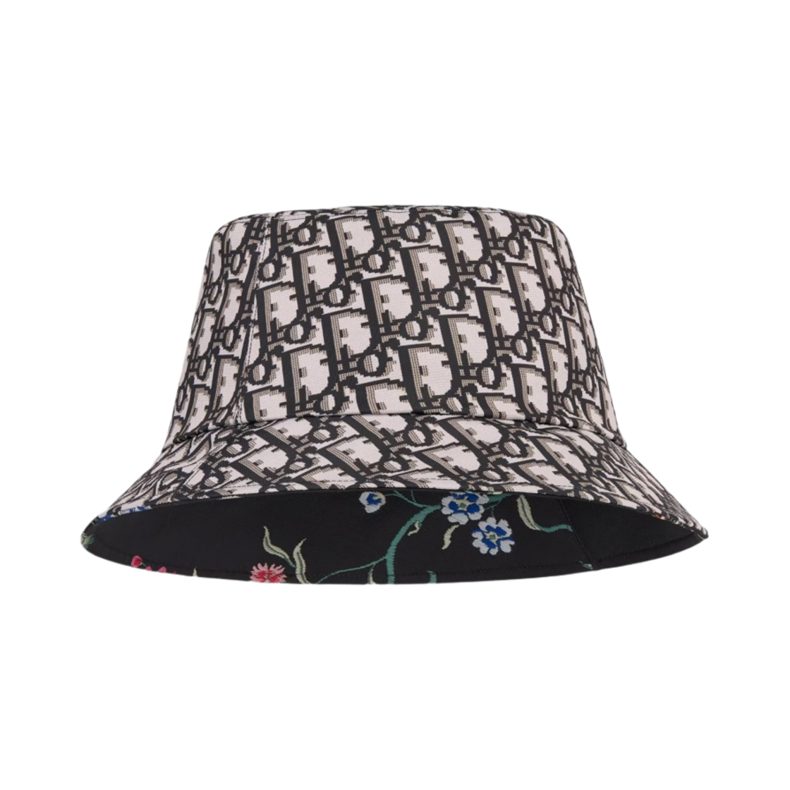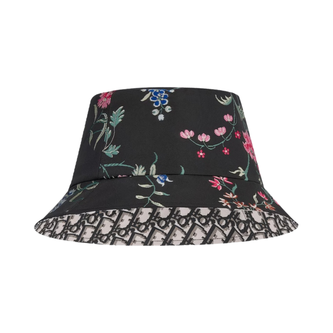 (W) Dior Teddy D Dior Petites Fleurs Reversible Small Brim Bucket Hat Black Multicolor Technical Jacquard