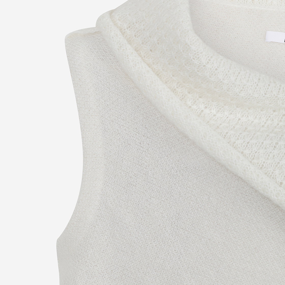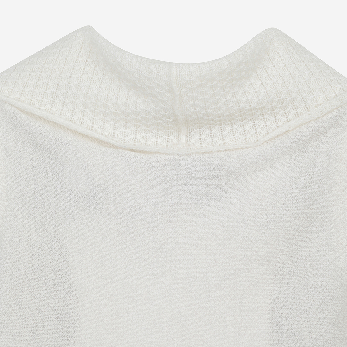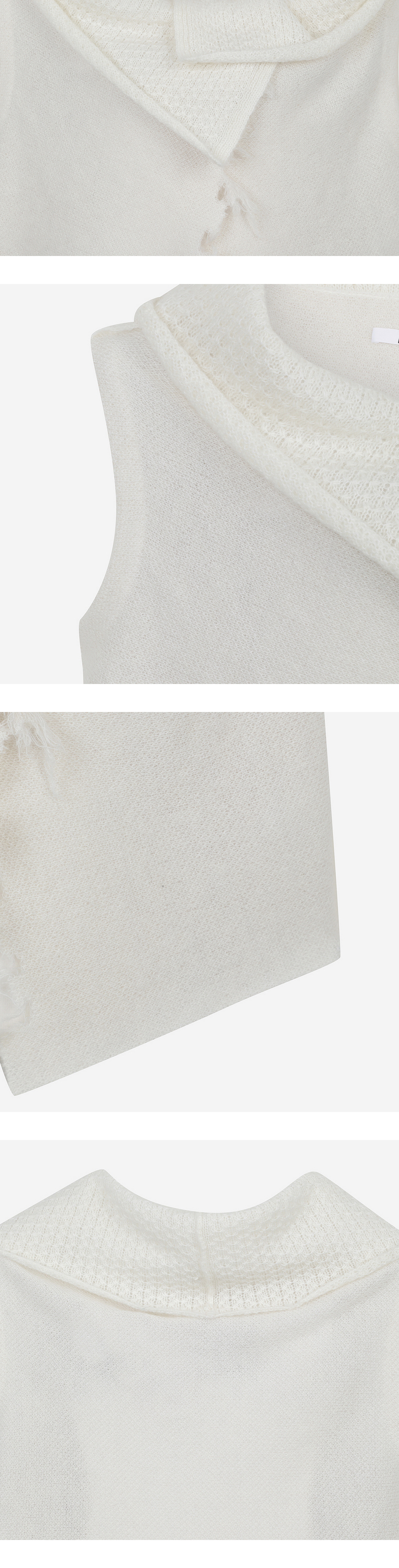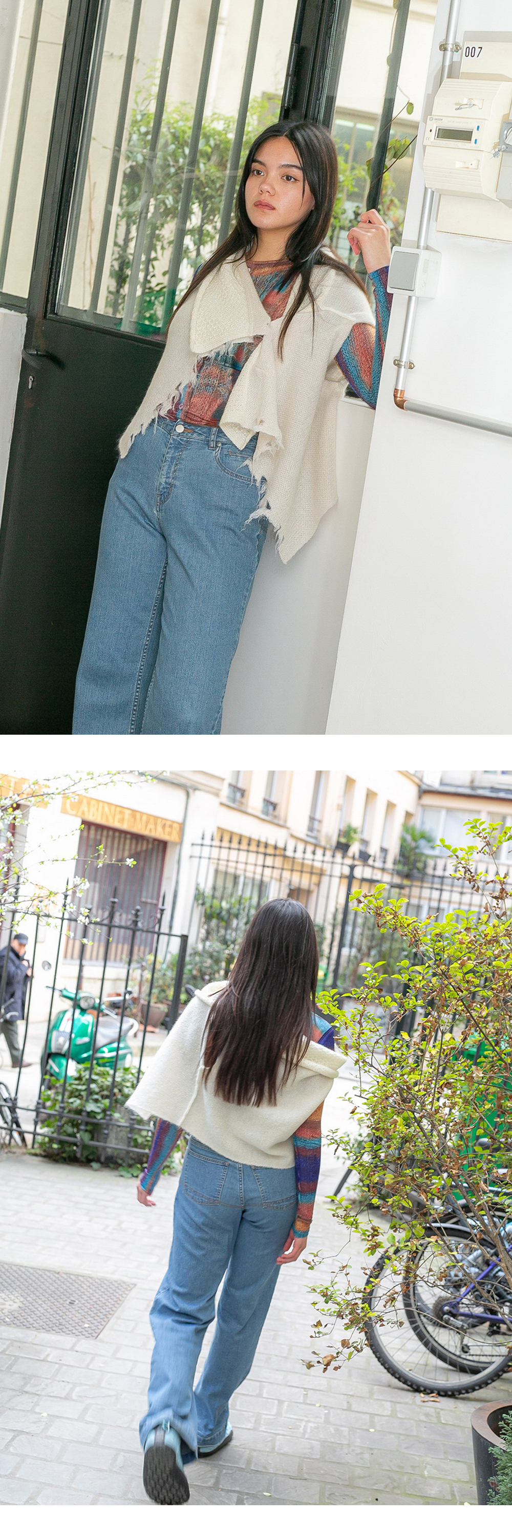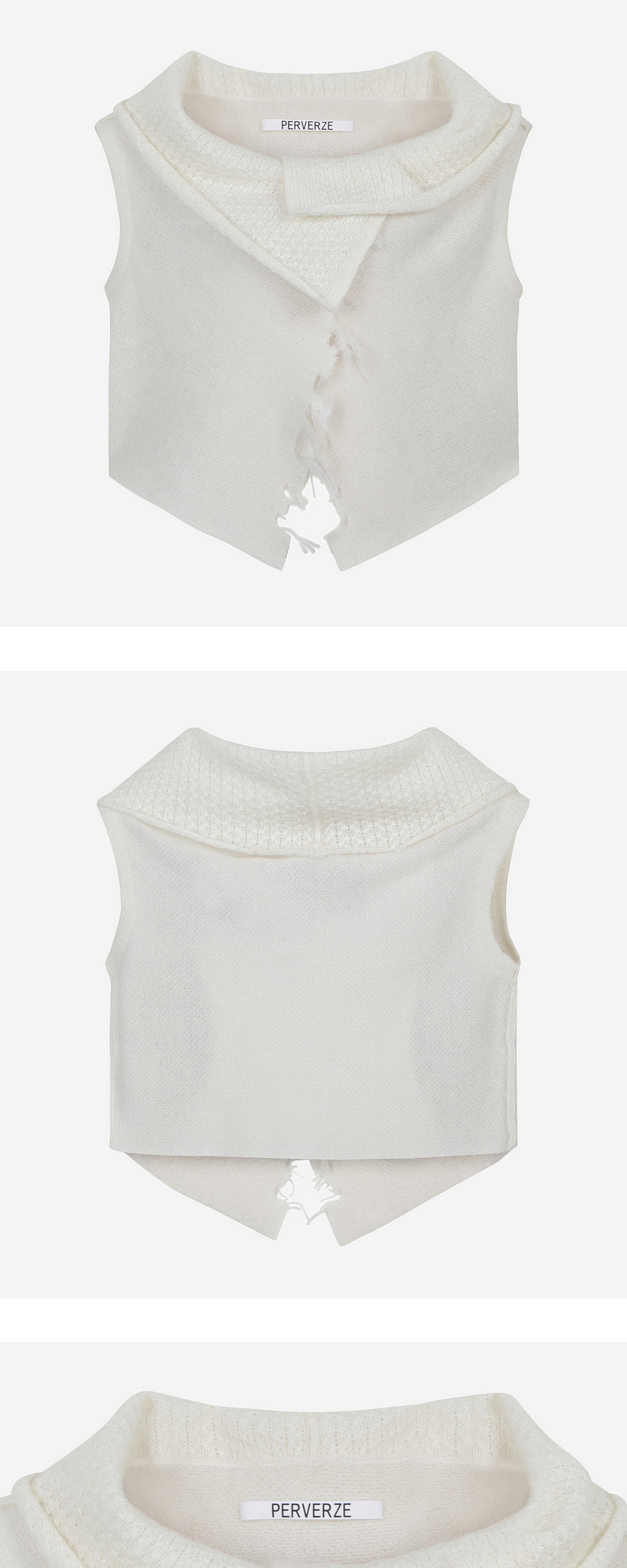 데미지 디테일이 매력적인 퍼버즈의 데미지드 모헤어 니트 베스트를 소개합니다. - 삼색 모헤어 혼방사 자카드 데미지 - 가공 디자인 - 와이드 앤 랩 배색 디자인 - 앞버튼 - 숏기장