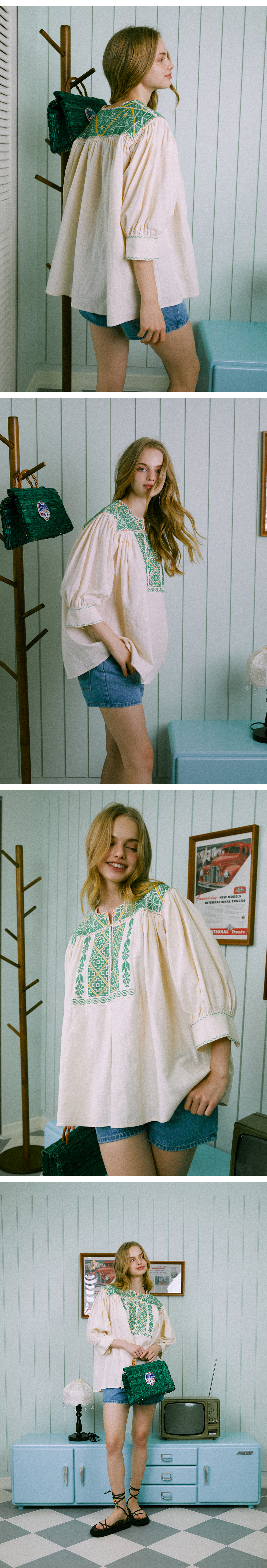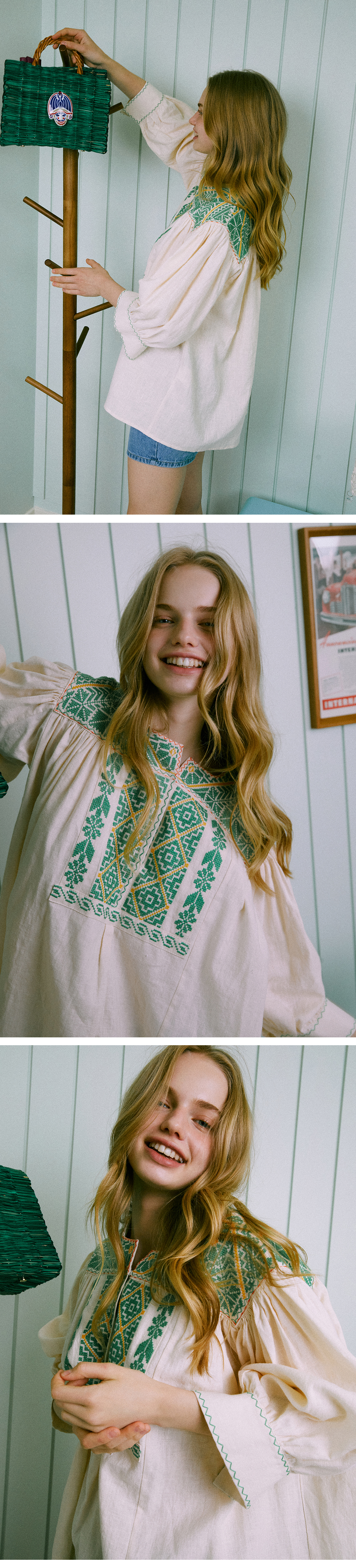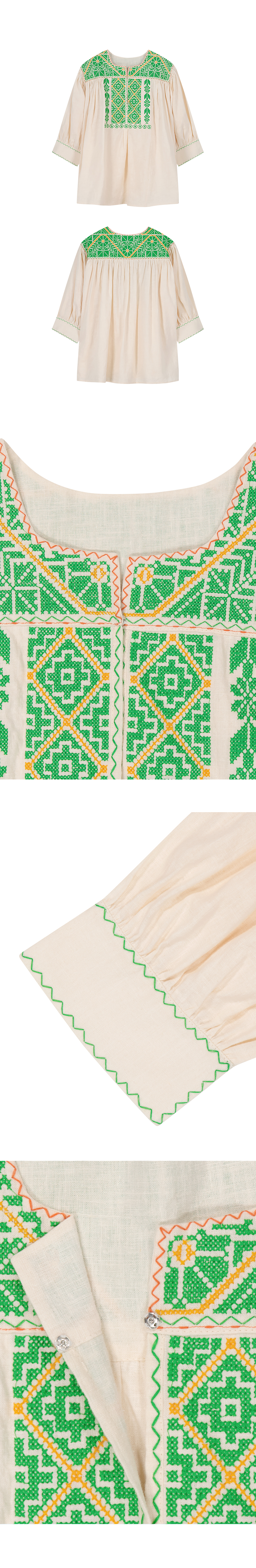 그린 버터 우먼 보헤미안 니들워크 린넨 블라우스 그린
