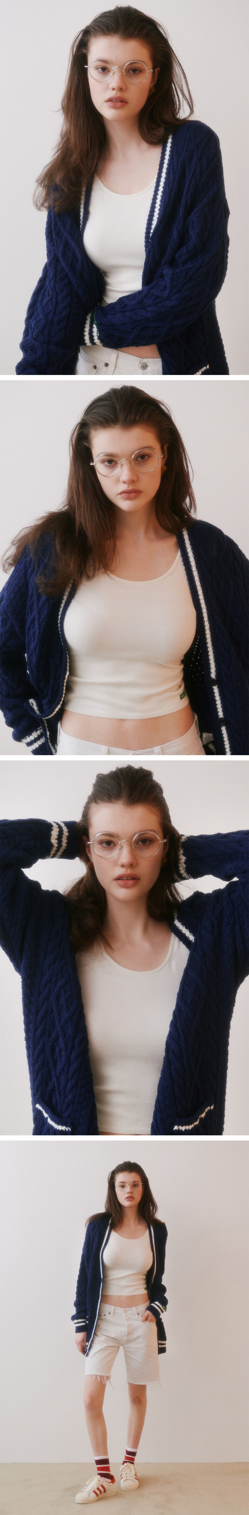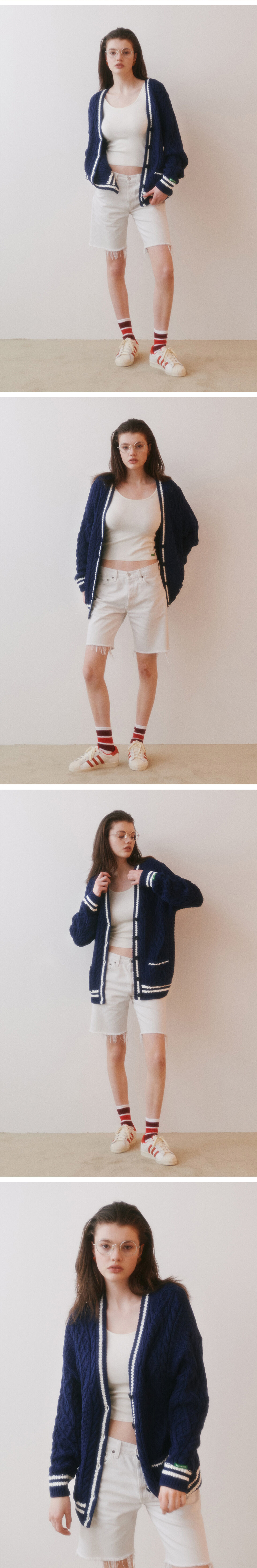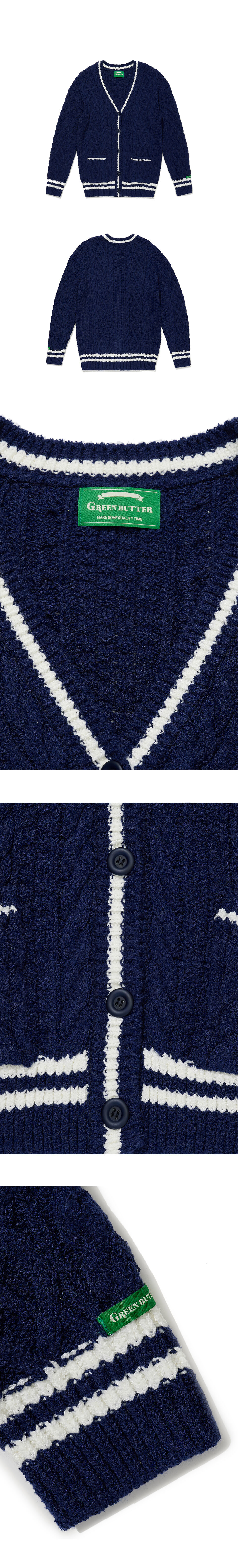 그린 버터 우먼 오버사이즈드 케이블 스트라이프 가디건 네이비