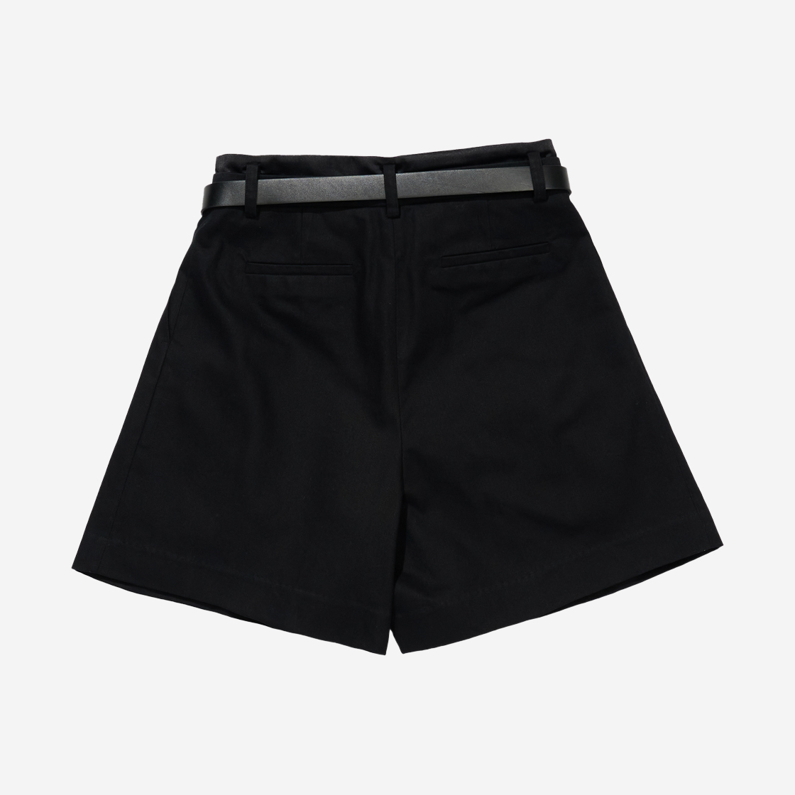 이중으로 이루어진 허리선이 특징인 반바지제품으로, 벨트와 함께 구성되어 있습니다. 허리의 핀턱선으로 더욱 완벽한 A라인형태의 쉐잎을 완성했고, 면 10수 원단을 사용해 사계절활용도가 높은 제품입니다.
