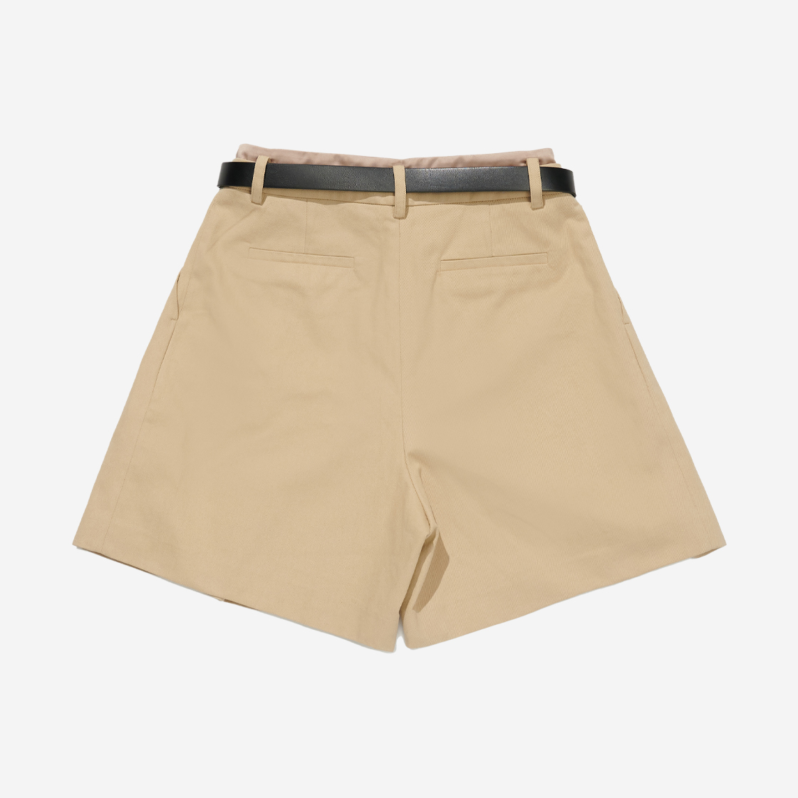 이중으로 이루어진 허리선이 특징인 반바지제품으로, 벨트와 함께 구성되어 있습니다. 허리의 핀턱선으로 더욱 완벽한 A라인형태의 쉐잎을 완성했고, 면 10수 원단을 사용해 사계절활용도가 높은 제품입니다.